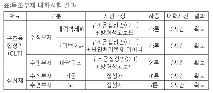 한국건설기술연구원은 ‘총 5개 구조에 대해 내화(재하)성능을 확인한 결과 매우 안정적으로 내화성능을 확보 할 수 있는 구조임을 확인’했고 구조용집성판(CLT)의 경우 방화석고보드와 같은 적절한 수단을 통해 내화성능을 안정적으로 확보할 수 있다고 말했다.