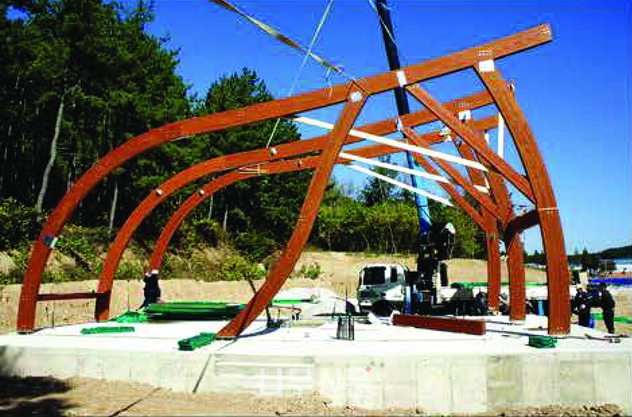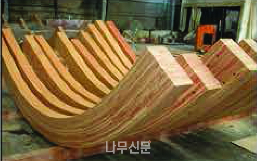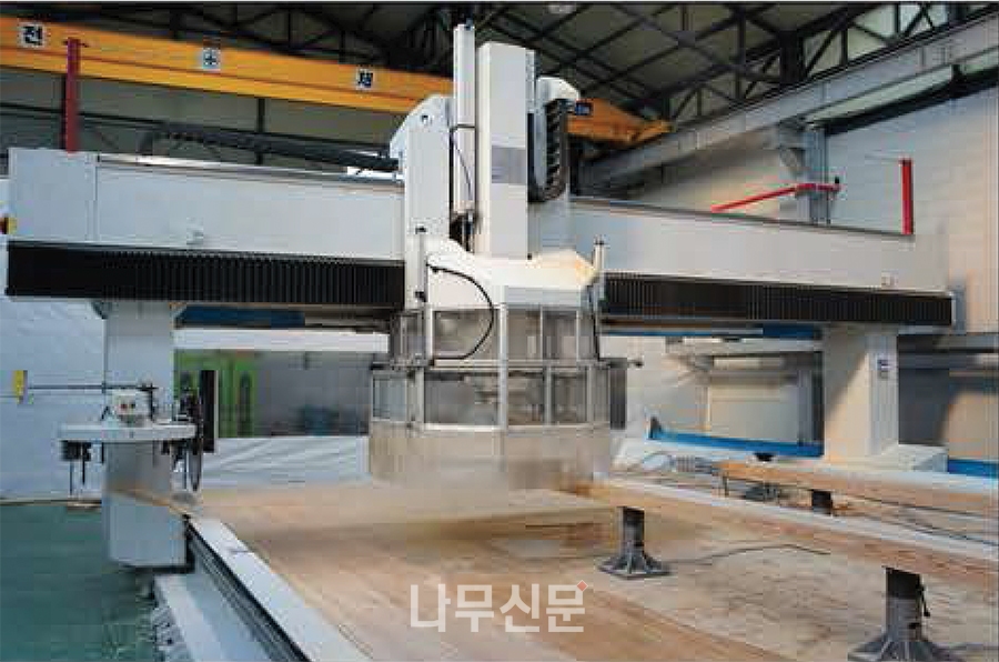 국산 낙엽송이 집성된 구조용집성재 하나의 크기는 두께 100㎜, 폭 500㎜로 경민산업 자체 공장에서 가공해 사용하고 있다.