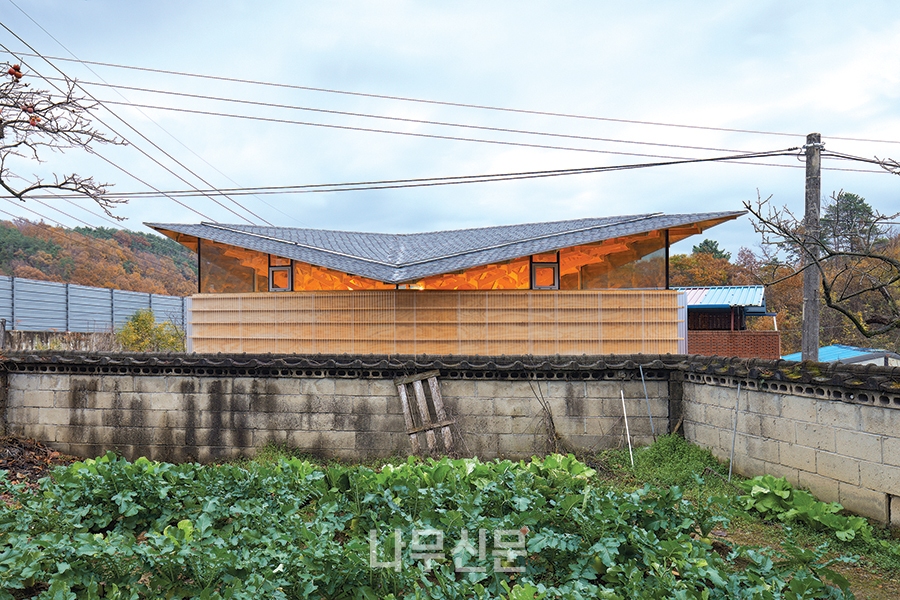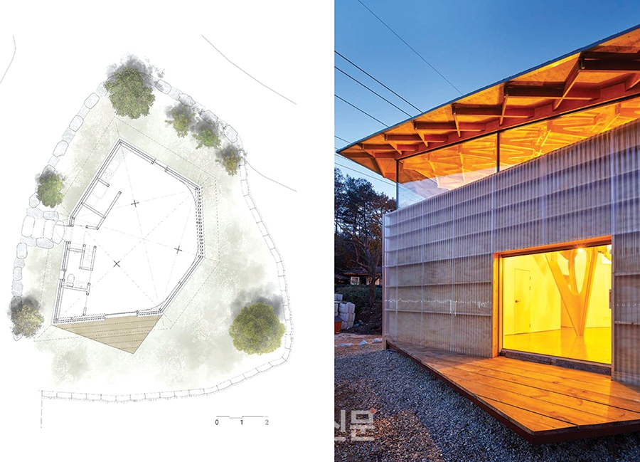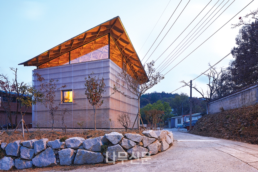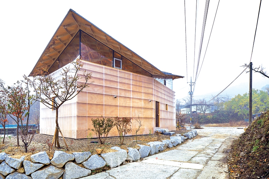 집의 외부 마감 역시 주변을 따른다. 시골 창고에 흔히 쓰이는 폴리카보네이트 골판은 집의 외부 벽체 마감이 되었다. 안쪽 켜에 있는 나무를 은은하게 보여주고 직사광선으로부터 보호해준다. 덤으로 새로운 공기층을 만들어내어 여분의 단열층이 된다.