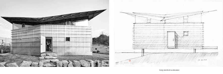 주변의 농촌 주택은 지붕에 대한 아이디어를 주었다. 수십 년 전 보급된 평지붕의 농촌 주택은 심각한 누수문제를 가진다. 자발적인 해결책은 샌드위치 패널로 만든 떠있는 얇은 박공지붕을 씌우는 것이다.