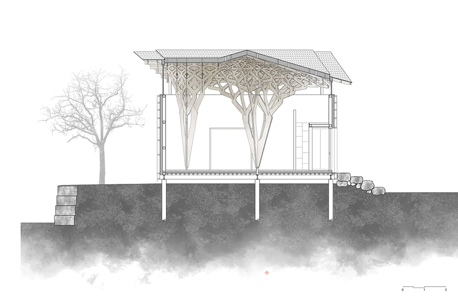 프로젝트에서 기술은 과거의 목수를 대신한다. 기술은 사라진 것을 되살리고 그것이 새로운 방향으로 진화할 수 있는 가능성을 준다. 집의 나무 구조체는 결구와 맞춤으로 이루어진다. 전통 방식을 재해석했음에도 못을 사용하지 않음은 과거 건축의 방식을 따르려는 의도가 아니다.