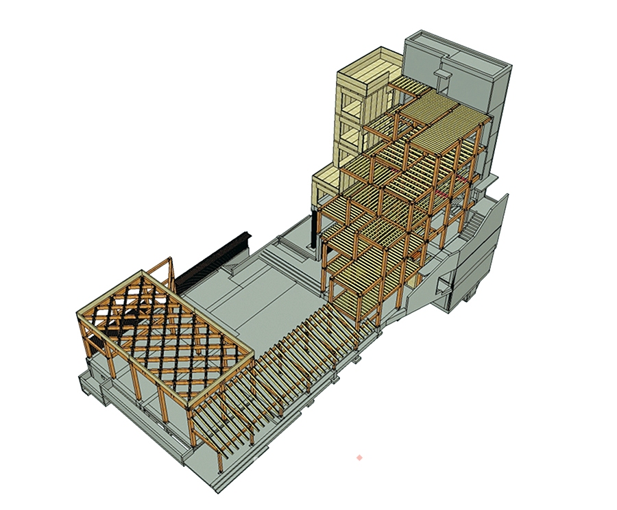 국내산 낙엽송을 활용한 구조용 집성재와 구조용 집성판 기술을 구축하는 계기를 마련했으며, 특히 철골 부재와의 혼용과 맞춤을 통해 현대의 기술과 감각에 적합한 결합 방식을 적용하였다.