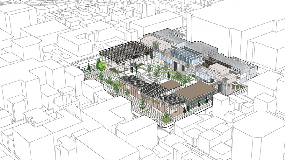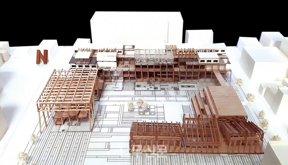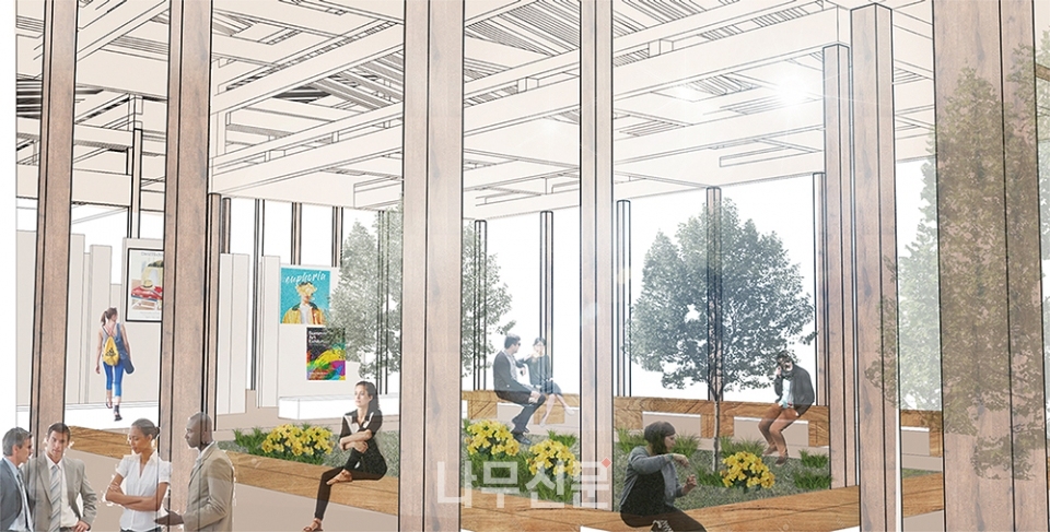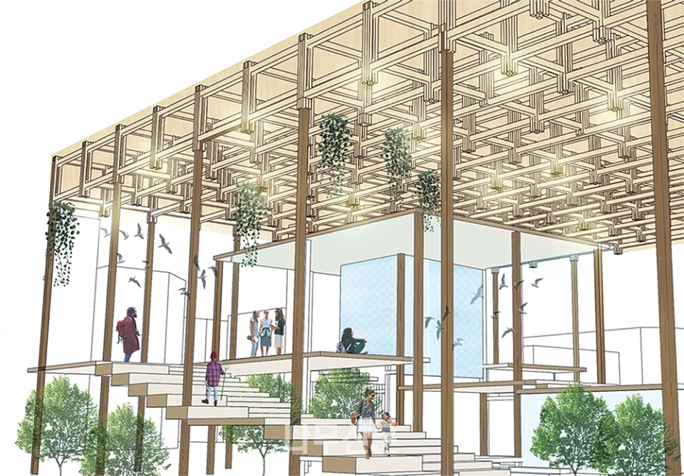 이 계획의 특징은 나무 루버를 이용하여 실내 및 실외의 공간을 다양하게 형성하고 있으며, 구건물과 신건물을 이어주는 나무 복도는 새로운 만남의 장소가 될 것이다.