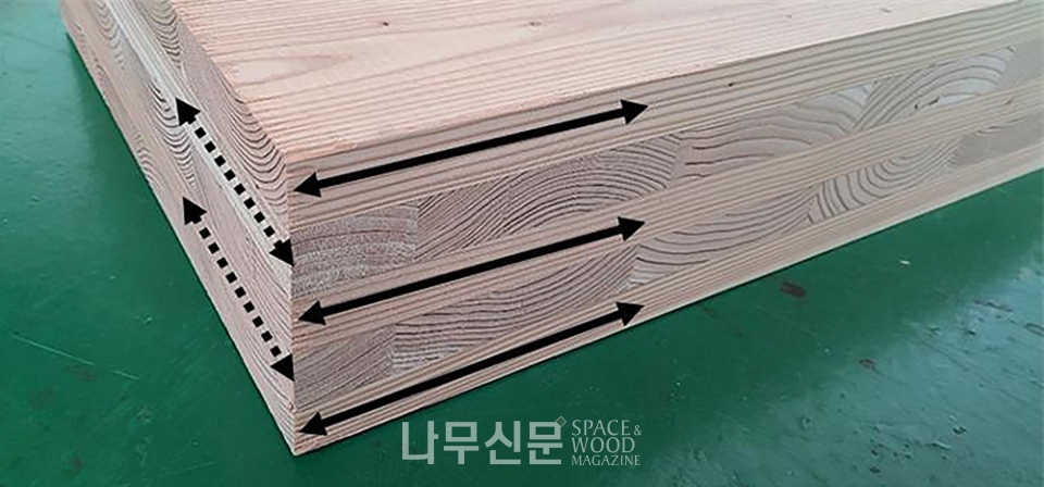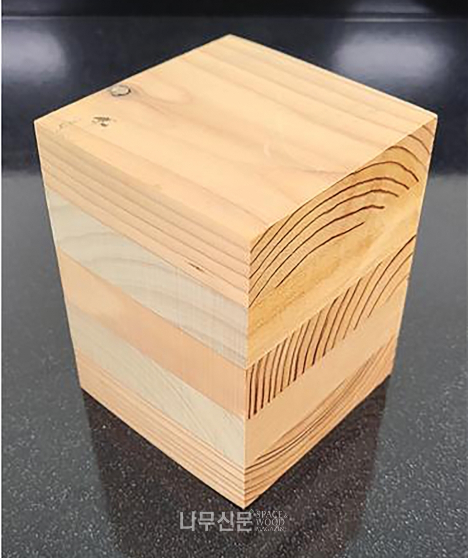 이번에 개발한 혼합 CLT는 낙엽송을 외층재로 사용하고 백합나무를 내층재로 사용해 제품 성능을 향상하고 목재자원의 이용 가치도 높였다는 평가다. 또 친환경적인 속건성 폴리우레탄 접착제를 이용해 구조용 CLT의 품질기준도 만족했다.