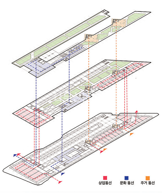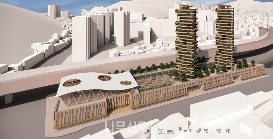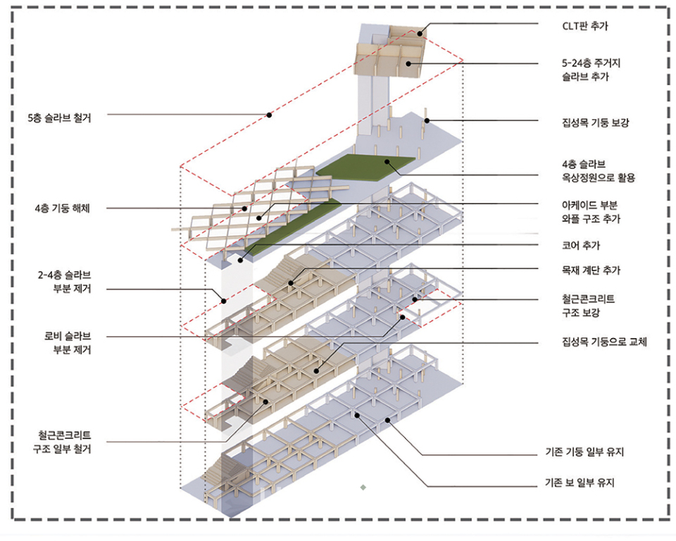 기존 유진상가는 라멘구조로 이루어져 있는데, 일부 구조를 허물고 목조로 다시 리노베이션하였다. 또한 기존 유진상가를 관통하는 고가도로는 소음을 유발하므로 인접 부분은 주차공간으로 활용하고, 확보된 여유 공간을 이용하여 목조로 높게 짓는다.