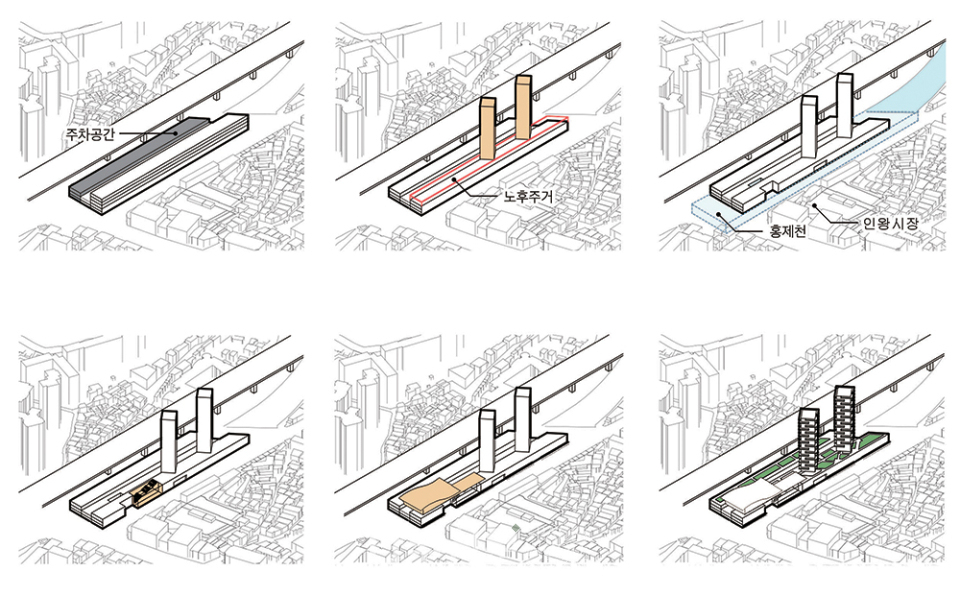 기존의 상업공간에 전시를 위한 문화시설을 도입하여 상권이 더욱 살아나도록 유도한다. 또한 홍제천과의 시각적 교류가 일어나도록 하고 인왕시장 이용객의 동선을 유도하여 지역 활성화가 이루어지도록 한다.