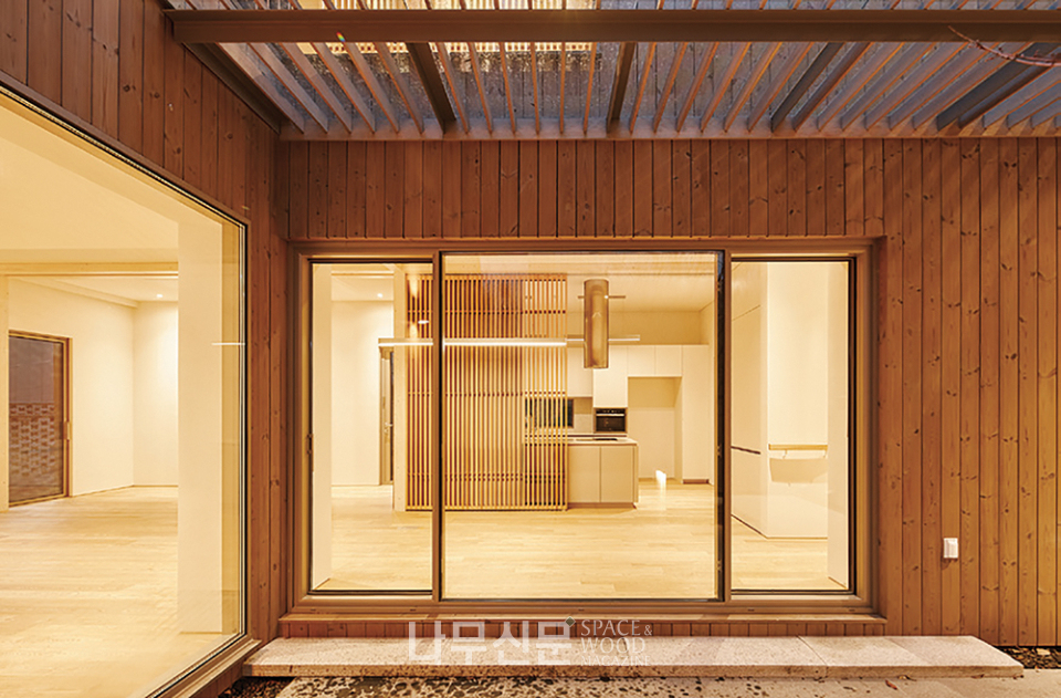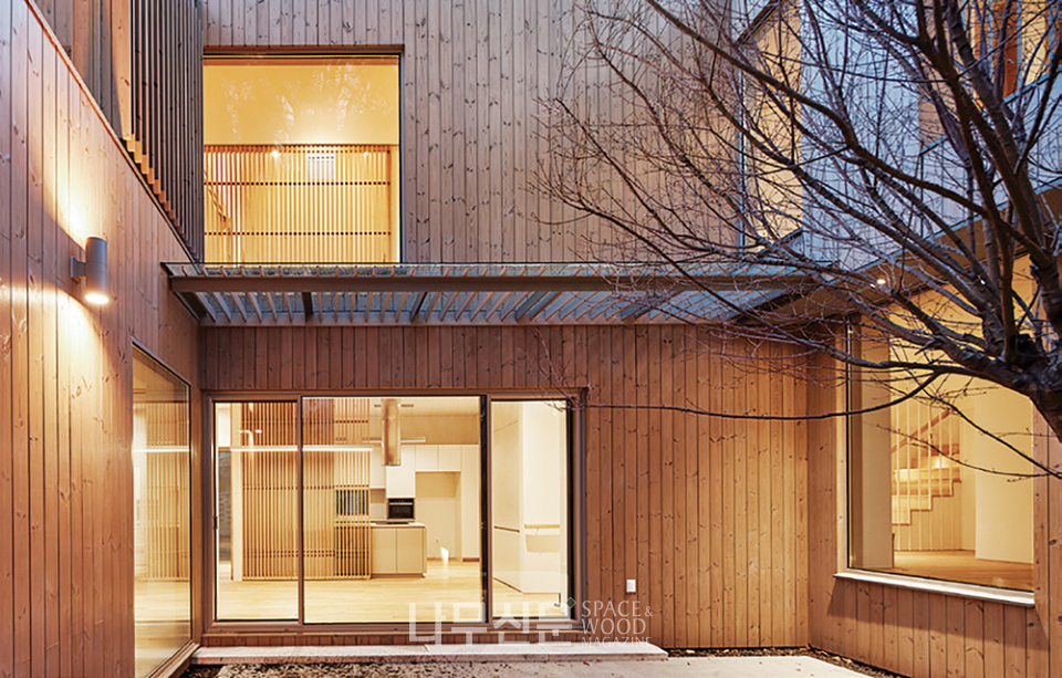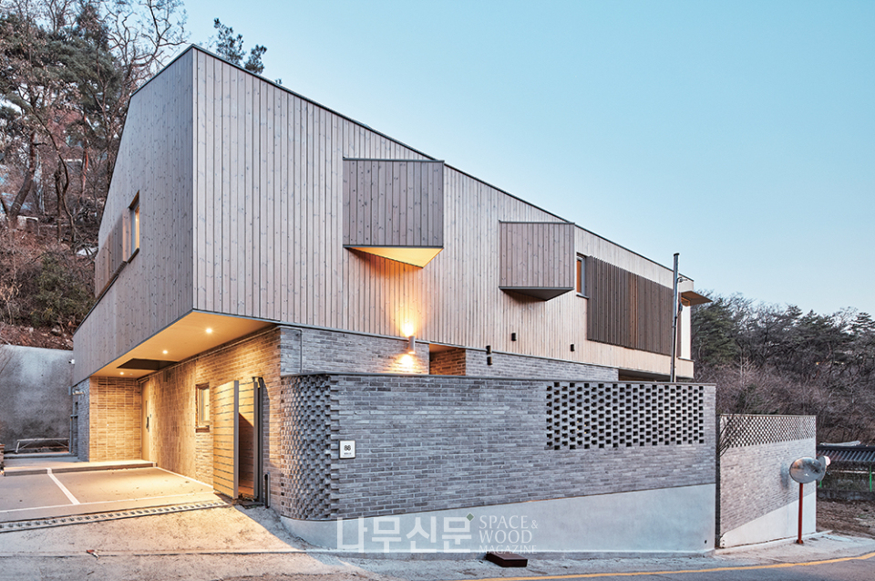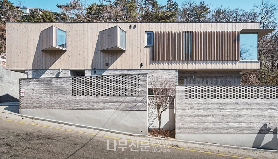 탄화목 목재 마감은 오픈조인트로 두 가지 방식으로 차별된 방식으로 적재적소에 활용하여 자칫 밋밋할 수 있는 외부경관에 리듬감을 더했다. /나무신문