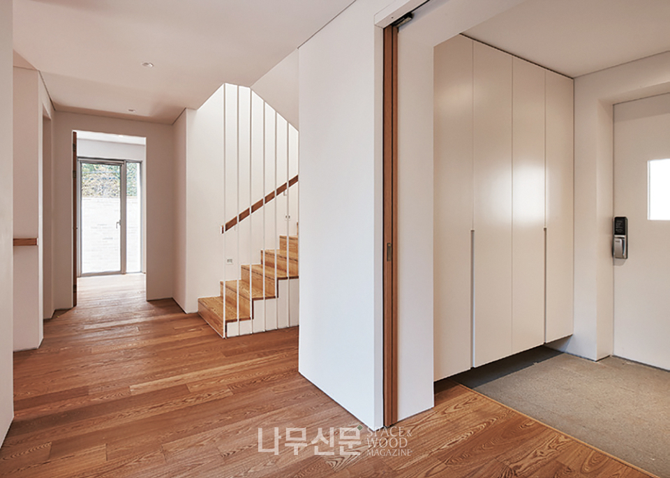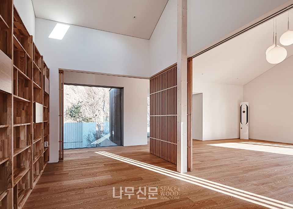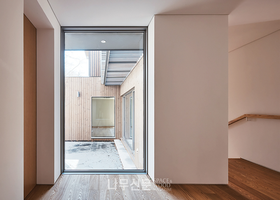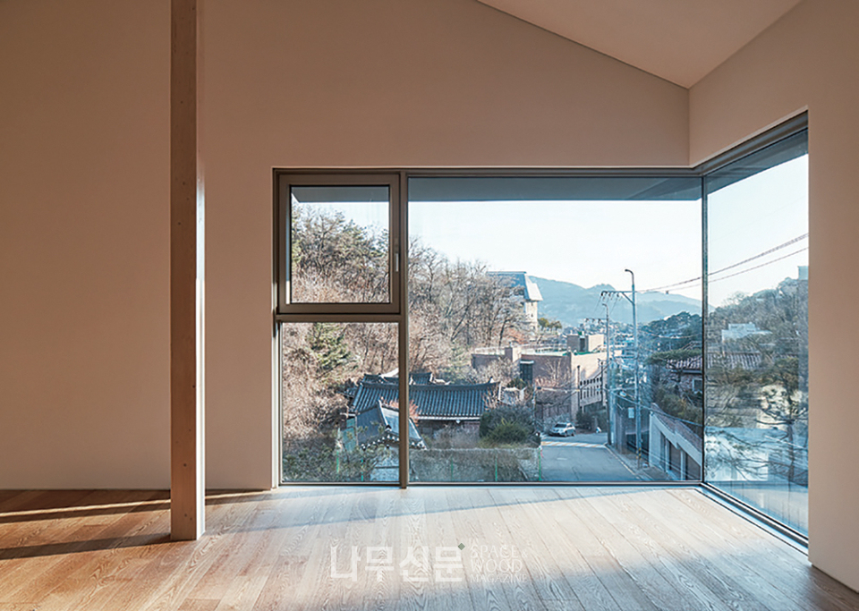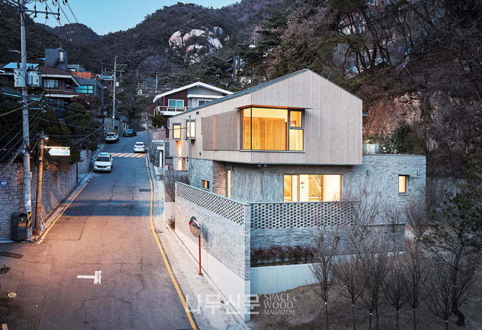 깎아지른 듯한 경사면의 기존 옹벽을 존치한 상태에서 계획하여야 하는 상황이라 습기에 대응하고, 충분한 자연 환기가 이뤄질 수 있도록 옹벽 쪽의 1층 매스는 철근콘크리트로 계획하였다. 그렇게 구성된 철근콘크리트 보를 중목구조의 기둥, 보와 2층 바닥장선과 결구되어 합성구조로 구성하였으며, 그 위에 경골목구조로 2층과 지붕을 구성하였다. 목구조로는 상대적으로 취약할 수 있는 옹벽과 베란다.
