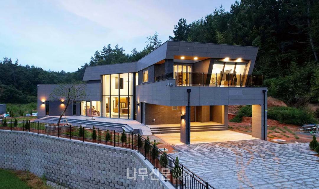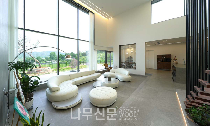 아울러 100평에 가까운 규모에 비해 침실 개수는 최소화 한만큼 거실이나 키친, 다이닝 같은 규모 있는 공용공간이 가능했다. 또 건물 후면의 홈캠핑 공간과 2층 피트니스룸과 서재로 이어지는 시원시원한 선굵은 연계를 통해 거주와 레저를 모두 만족시켰다.