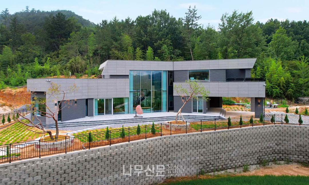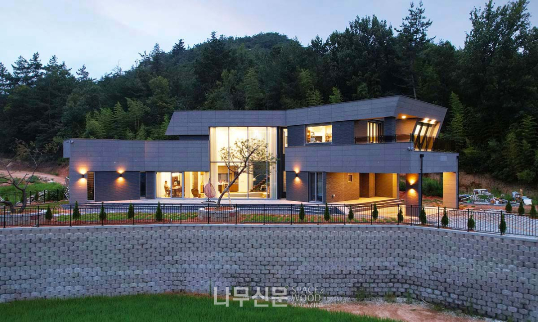 건축주 또한 대지의 자연스러운 흐름을 살린 집을 원했다. 뒷산을 오롯이 담으면서 딱 그만큼 마을 앞 들판의 전경을 품은 기품 있고 힘 있는 건축물을 희망했다.