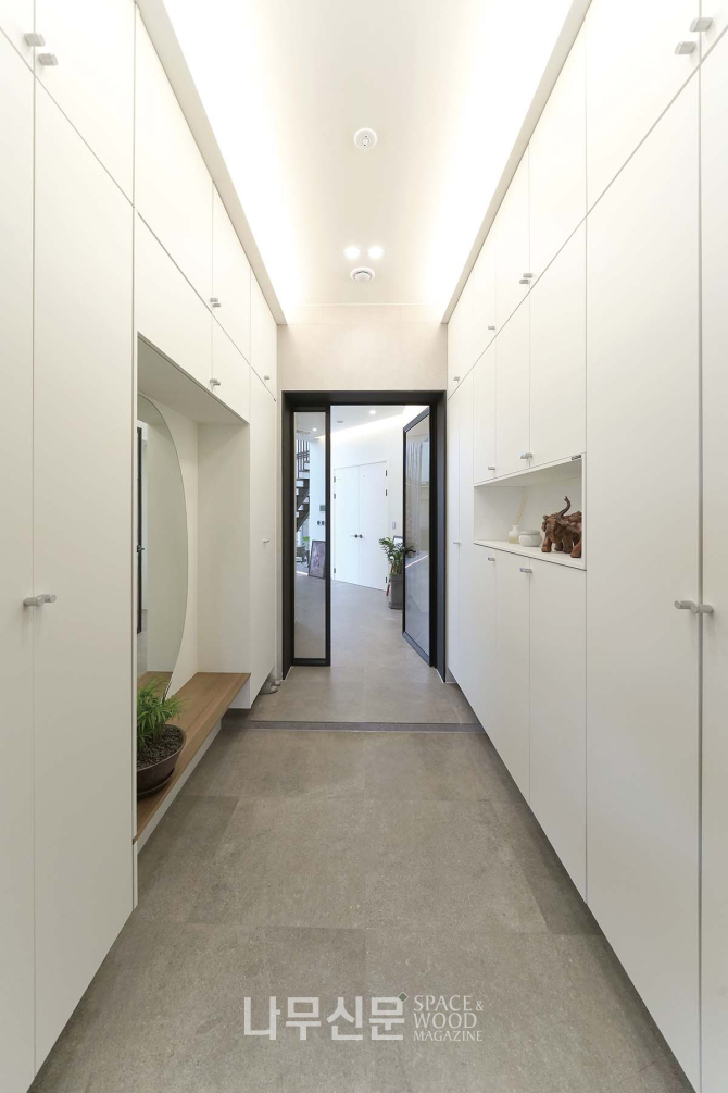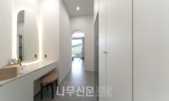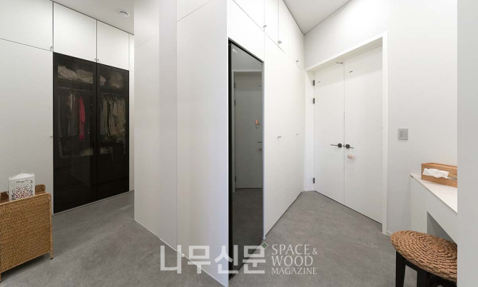 드레스룸은 벽과 같은 톤의 화이트톤으로 붙박이장을 제작해 수납의 기능을 살리고 깔끔하고 미니멀하게 연출했다.