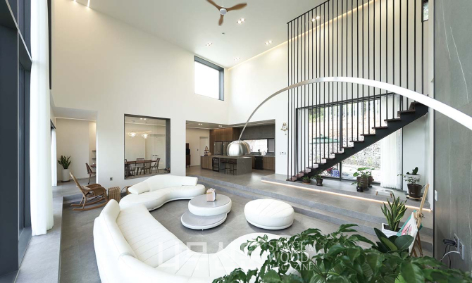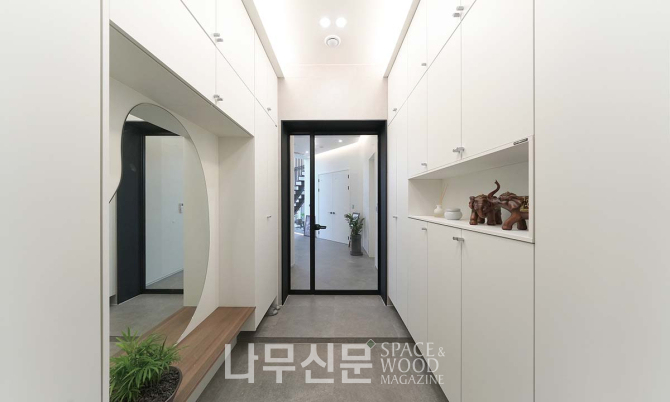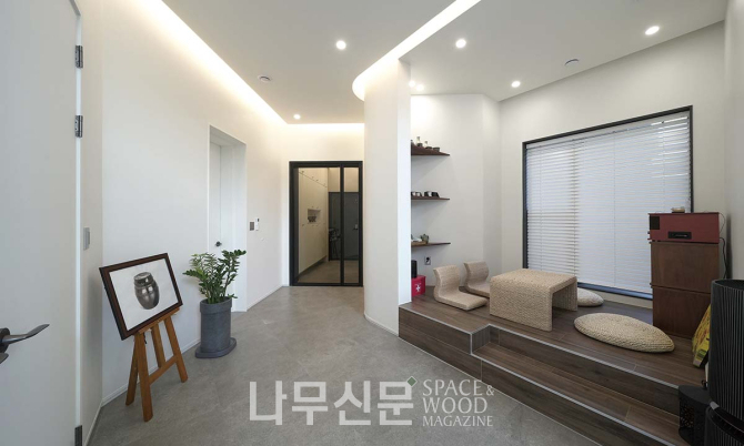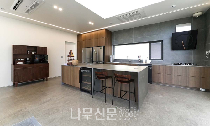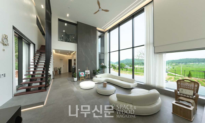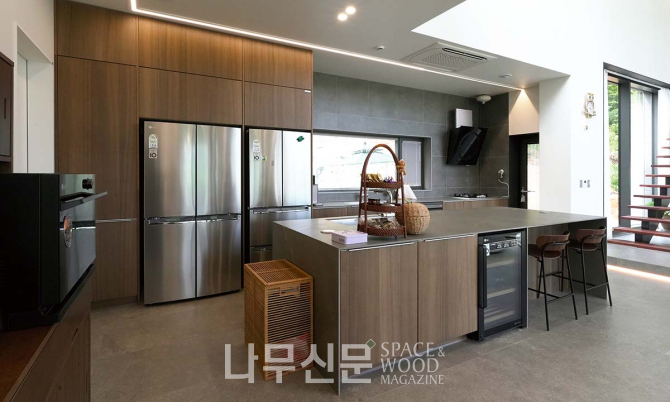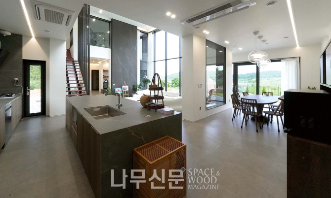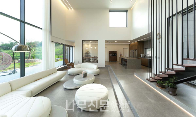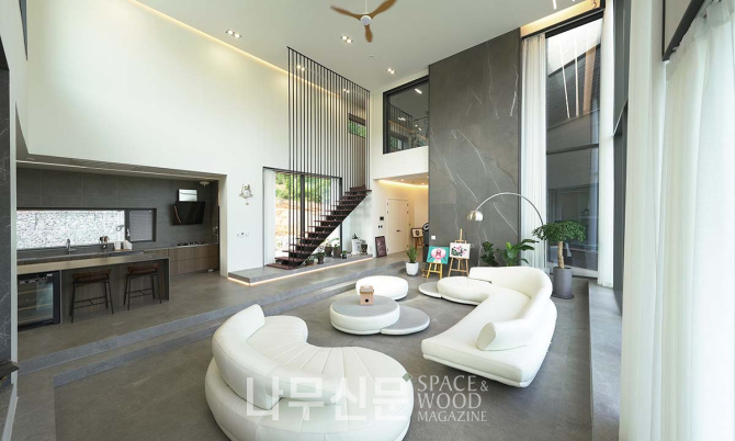 현관에서부터 이어지는 짙은 그레이색 포세린타일을 따라 한실을 지나 마주하는 공간이 거실이다. 2층 높이까지 오픈된 천정과 창문으로 엄청난 개방감을 주며 그 높이만큼 길게 디자인된 아트월은 빅슬랩타일로 매스감을 더했다. 이를 통해 거실이 이 집의 중심이 되는 공간임을 바로 알아차릴 수 있다.