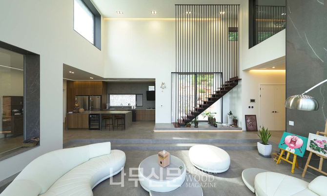 거실과 주방 사이의 계단이 배치된 바닥은 한 스텝 올리고 하부에 간접조명을 매입해 계단 공간을 강조했다. 그 위로 시작되는 빔계단과 와이어 난간은 거실의 가장 큰 포인트 요소 중 하나다.