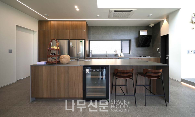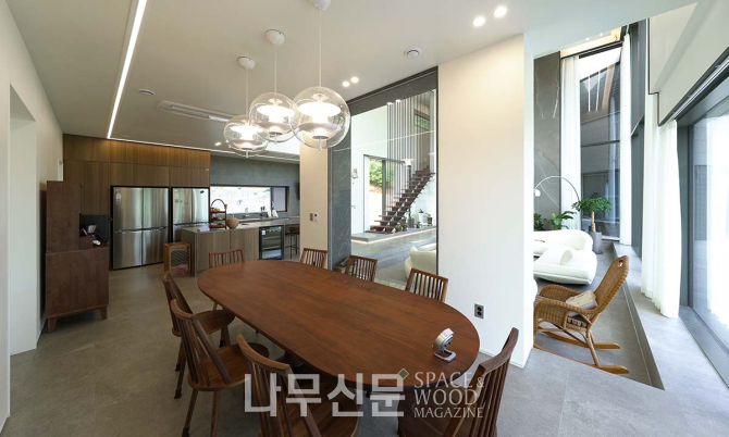 거실과 주방은 시각적으로는 오픈돼 있지만 바닥의 레벨 차이와 주방에서 식당까지 이어지는 라인조명을 설치함으로써 그 느낌만으로도 공간을 구분할 수 있게 해준다.