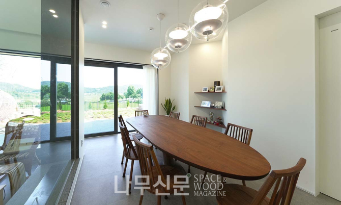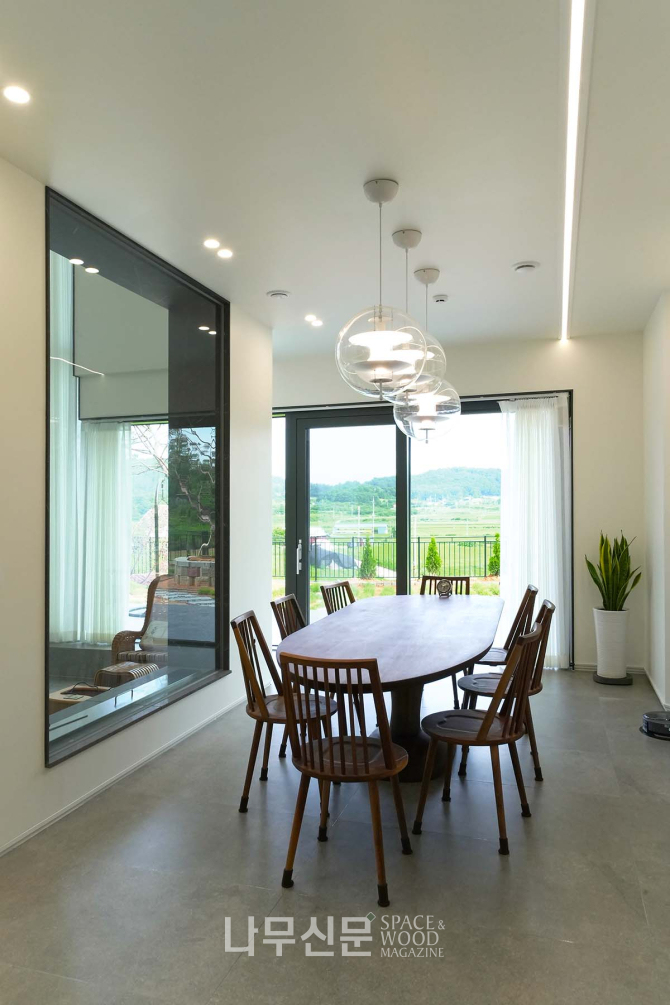 그리고 식당은 유리벽을 세워 폐쇄적이지는 않지만 보다 확실하게 거실과 공간을 분리시켰다. 이렇게 벽 하나만으로도 공간이 아늑한 느낌이 들고 여기에 더해 우드 톤의 가구배치로 내추럴하고 편안한 무드를 연출했다.