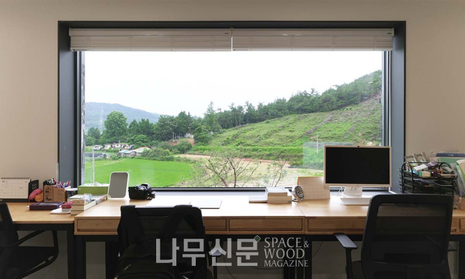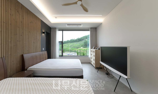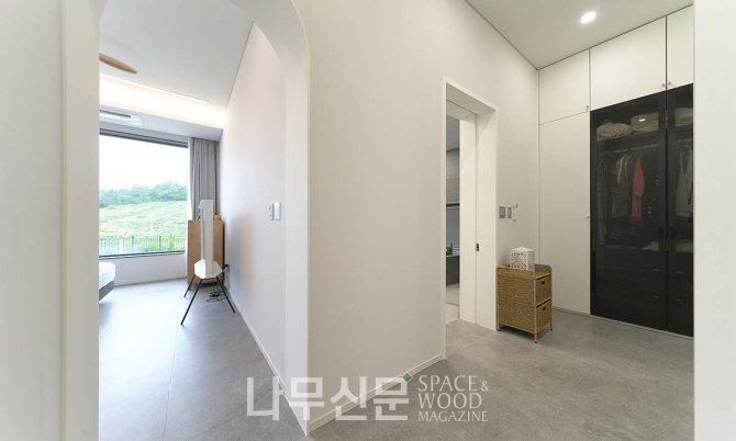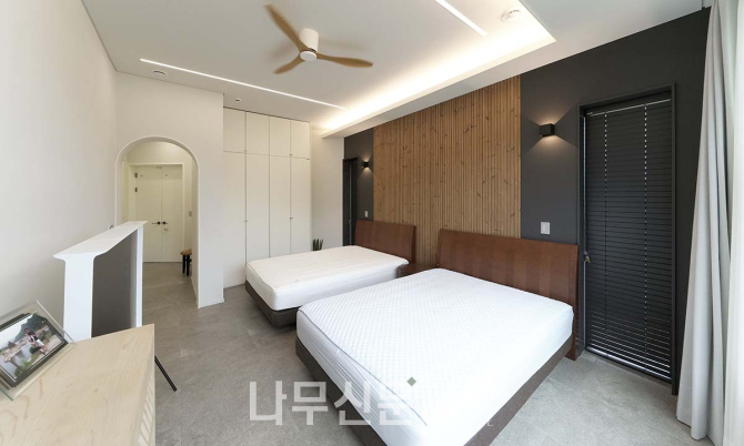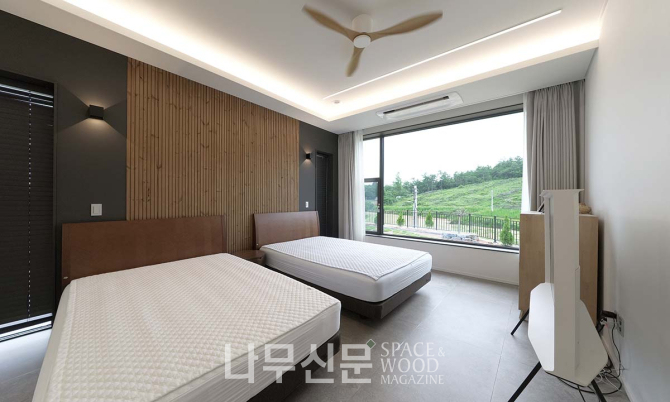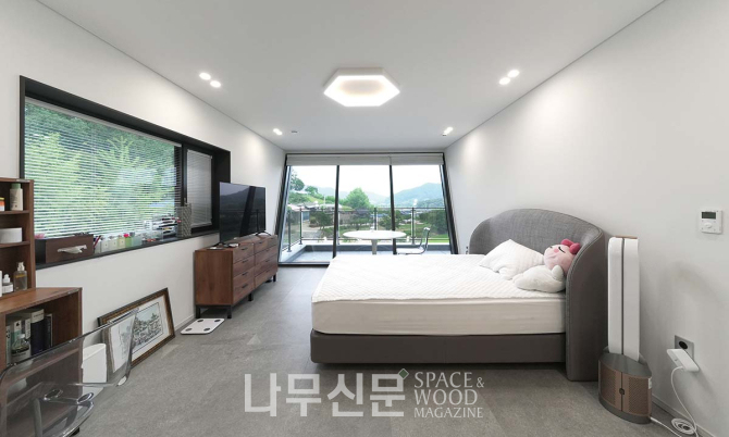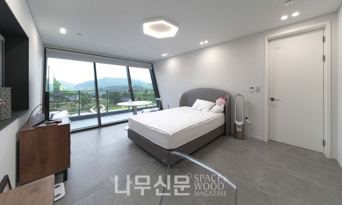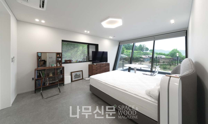 서재를 지나 배치된 이 침실 역시 서재와 마찬가지로 디자인 요소를 절제하고 미니멀하게 연출했다. 또 외부를 향해 사선으로 열려 있는 커다란 창문을 통해 외부를 최대한 조망할 수 있도록 했다.  /나무신문