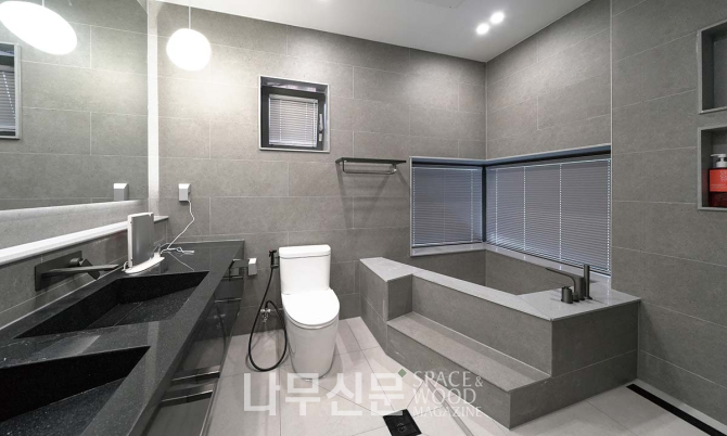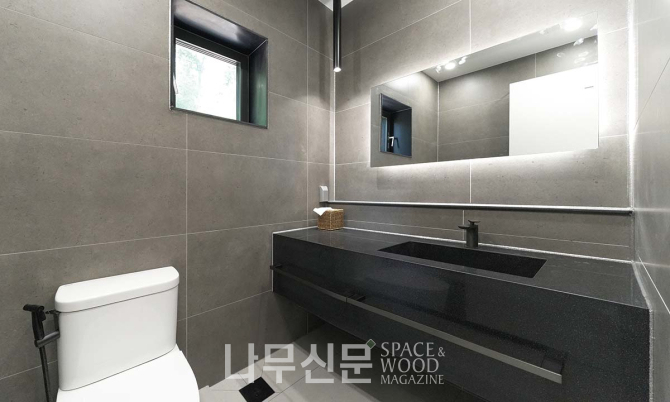 화장실로만 계획된 이 욕실은 짙은 그레이 톤의 타일과 블랙 인조대리석으로 제작된 세면대, 그리고 블랙수전과 블랙 액세서리로 차분하고 모던하게 디자인하고 간접조명이 매입된 거울과 직부 형태의 팬던트등으로 세련미를 더했다.