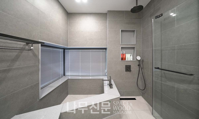 스톤 느낌의 짙은 그레이 색 포세린타일로 바닥에만 무게감을 주었다. 밝은 벽과 크게 오픈된 천정으로 깊이감을 극대화하고 우드벤치와 비정형 거울이 포인트다.