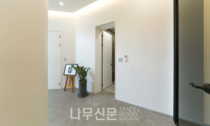 주방을 지나 배치된 안방은 전실, 드레스룸, 욕실까지 크게 하나로 연결된 마스터룸으로 계획했다. 전실은 양개도어를 달고 안방과 드레스룸은 게이트를 오픈해, 이 마스터룸 안에서 자유롭게 드나들 수 있도록 했다. 안방의 침대 헤드 쪽으로 우드 찬넬루버를 적용하고 간접조명과 간접벽부등으로 따뜻하고 편안한 느낌을 부여했다.