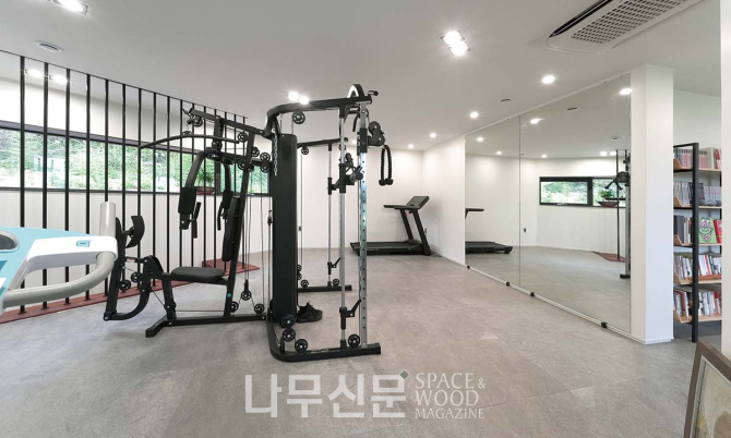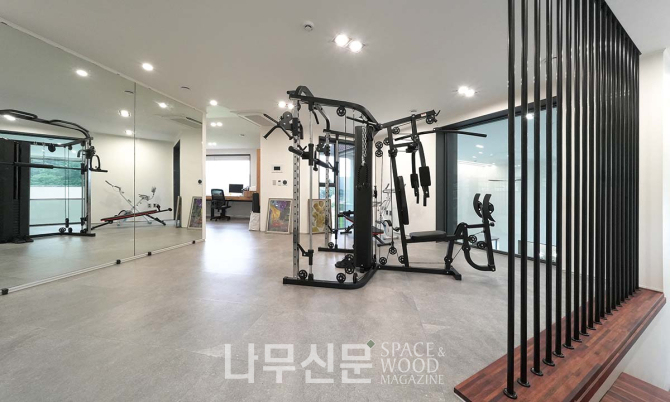 2층으로 올라와서 바로 마주하는 개방된 공간의 운동실이다. 1층 거실과 주방을 조망할 수 있는 통창을 배치했다. 통창 너머로 보이는 맞은편 창문의 풍광까지도 즐길 수 있도록 해 지루하지 않은 운동공간이 조성됐다.