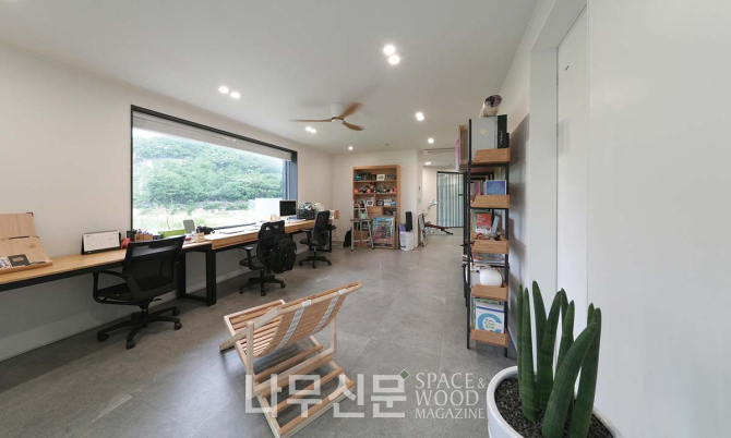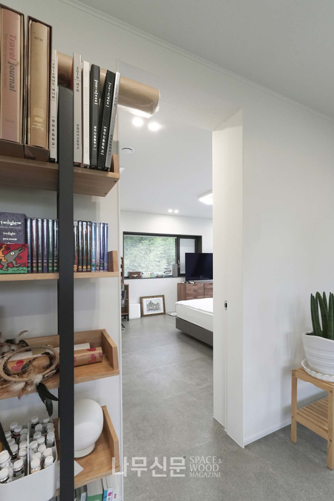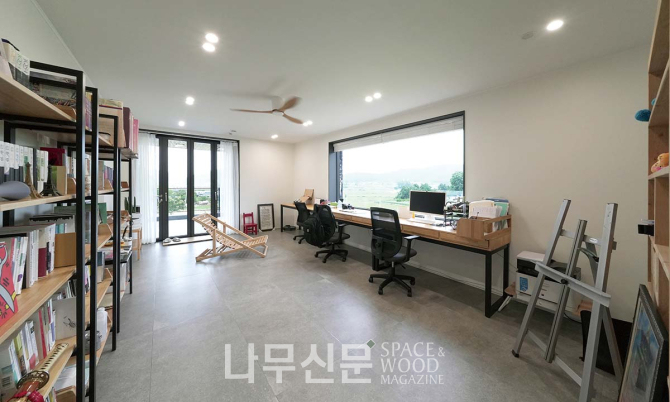 운동실을 지나 배치된 서재공간은 디자인 요소를 최대한 절제하고 외부로 연결된 테라스와 창문으로 외부의 멋진 풍광을 내부공간으로 최대한 흡수할 수 있도록 했다.