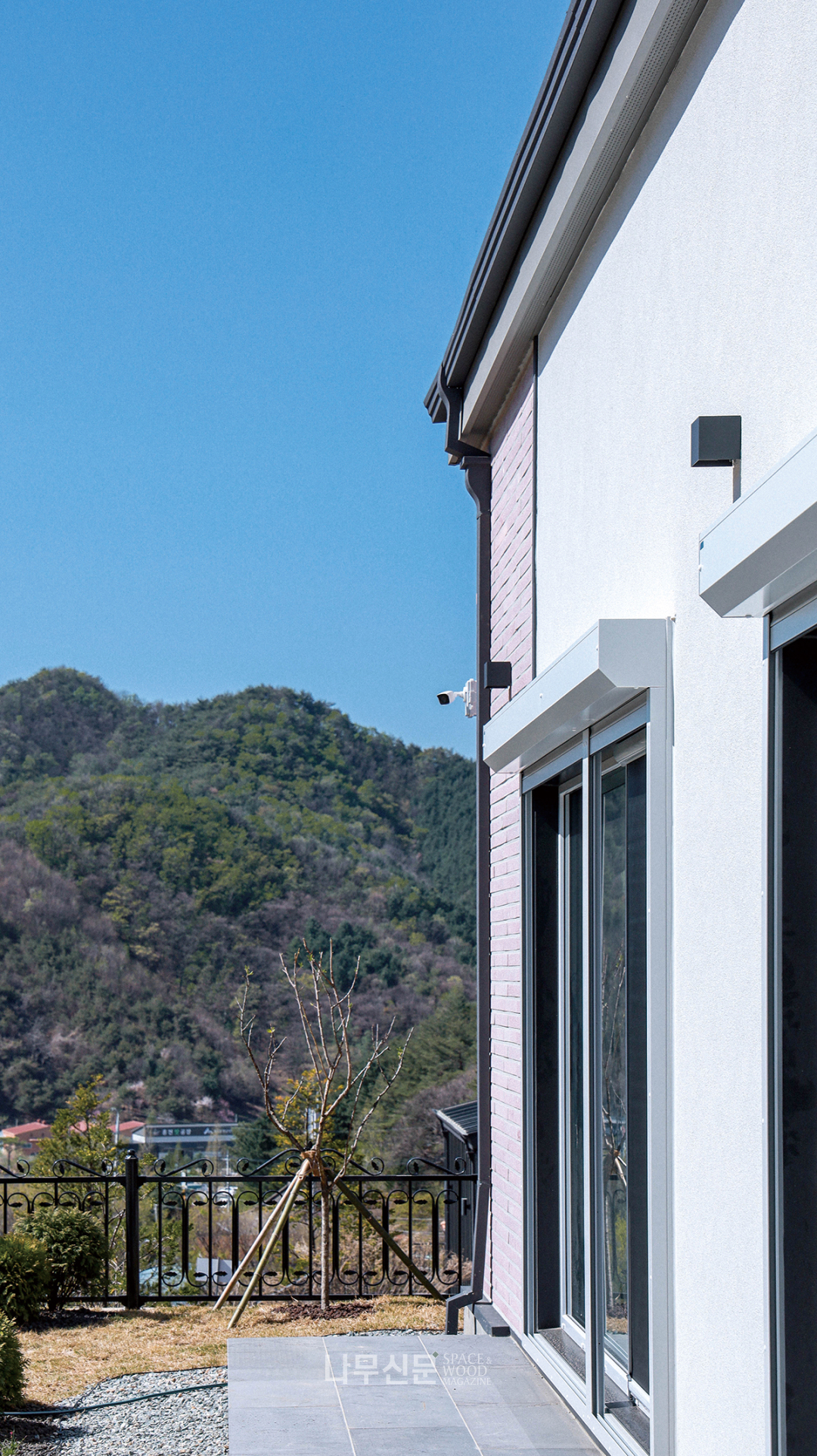 외벽 마감은 스타코프렉스와 모노롱타일을 사용했다. 재료분리 후레싱을 이용해 각각의 재료를 구분했으며, 볼륨감이 부족한 밋밋할 수 있는 외관을 풍성하게 만들었다.