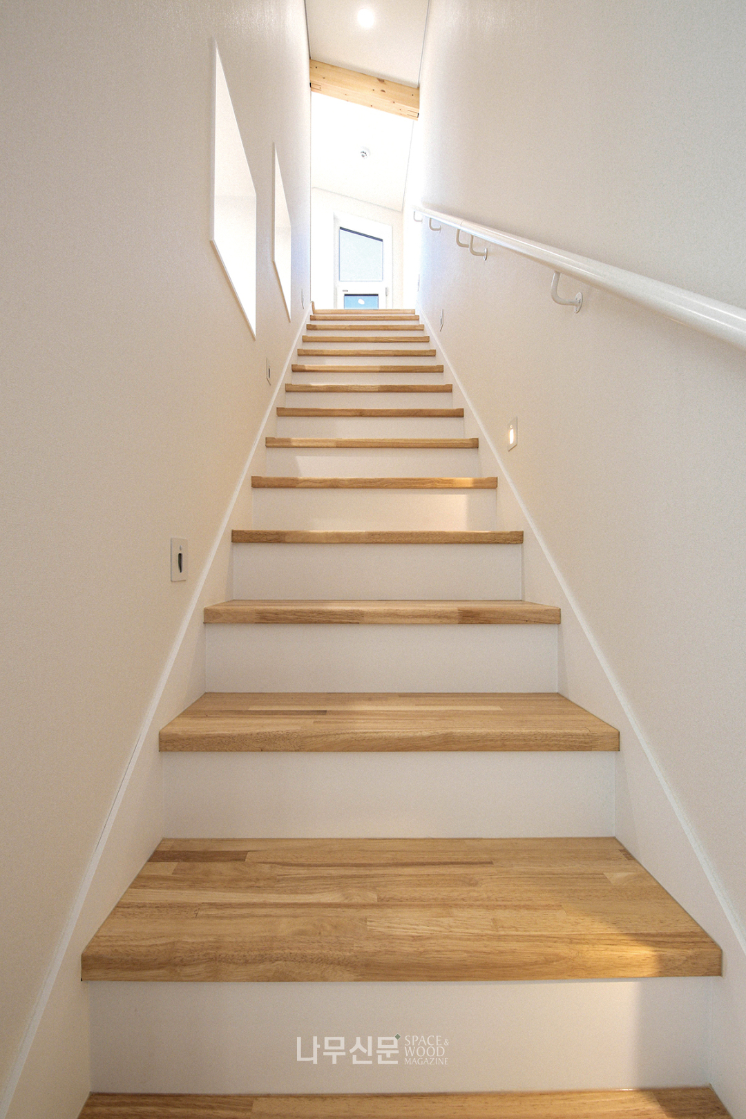 계단 계단 하부창고는 가구도어로 마감해 당겨서 여는 경첩을 안보이게 했다. 그리고 틀도 최소화하고 창고 공간을 최대로 활용할 수 있게 했다. 계단으로 올라가는 벽에는 다락에서 볼 수 있는 책 또는 오브제를 둘 수 있게 벽을 타공해, 반대쪽 아트월의 공간만큼 더 깊게 뚫어 주었다