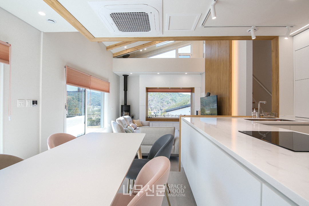 거실 아트월 디자인과 서까래가 만나 오픈천정인 거실의 개방감을 증폭시켰다. 위로 살짝 보이는 다락의 난간은 유리로 시공해 공간에 최대한 스며들게 했다. 또 큰 창을 활용한 윈도우시트와 분위기 있는 벽난로가 거실의 자유롭고 편안한 분위기를 한층 업그레이드 해주었다.