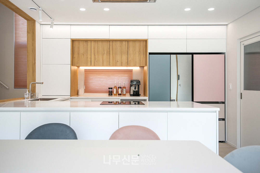 주방 거실과 주방의 단차로 인해 생긴 마감벽을 활용해 자연스럽게 오픈주방을 강조 할 수 있는 디자인을 구상했다. 우드 테두리로 주방공간을 분리하며, 붙박이 가구에 미니바를 함께 포인트를 주었다.