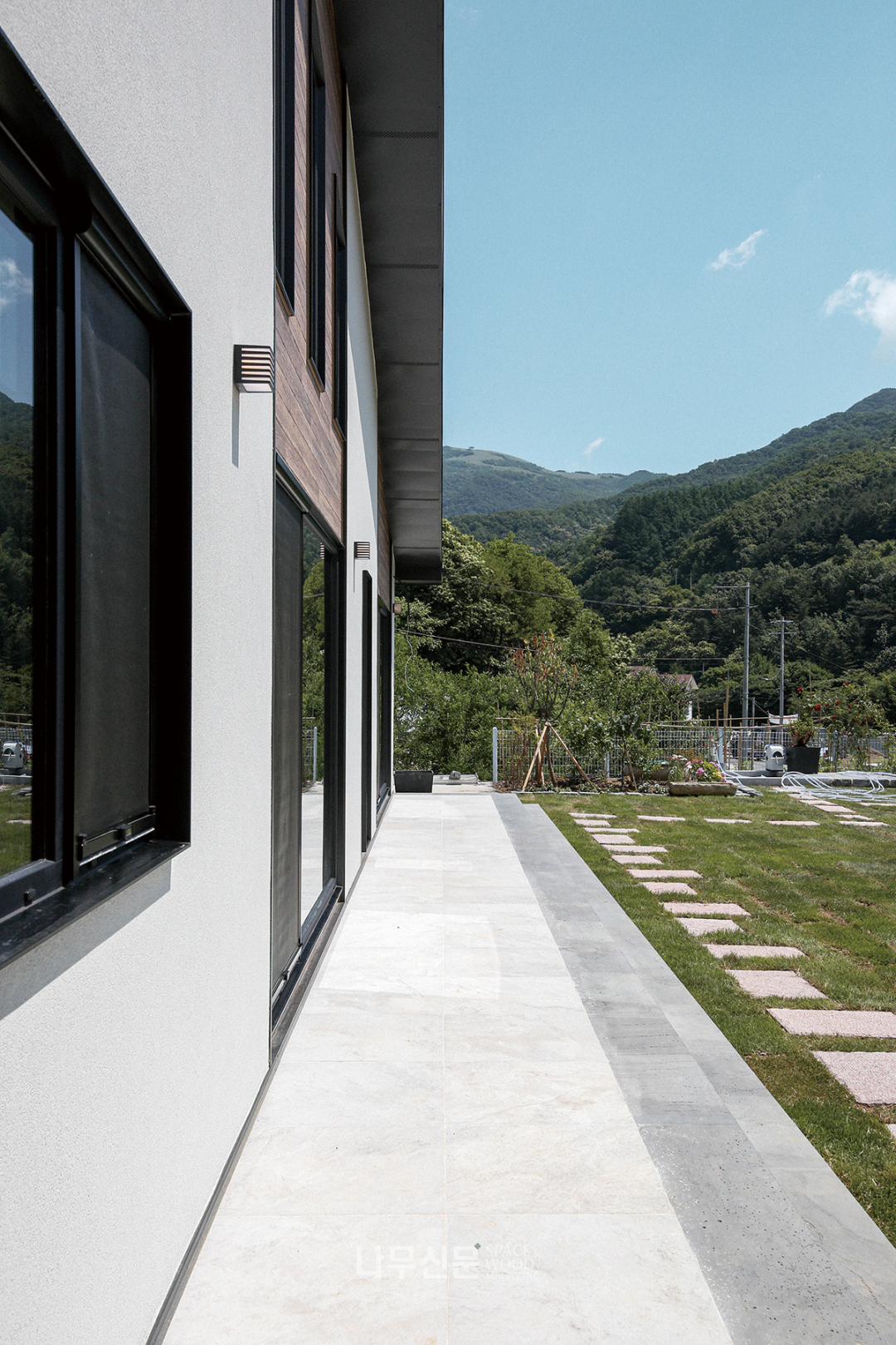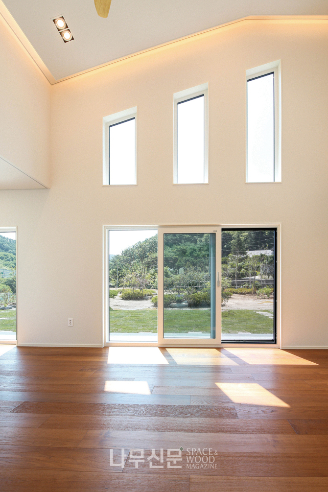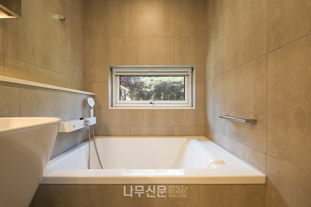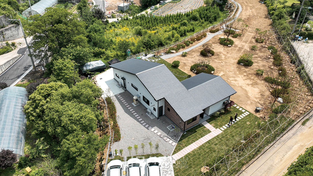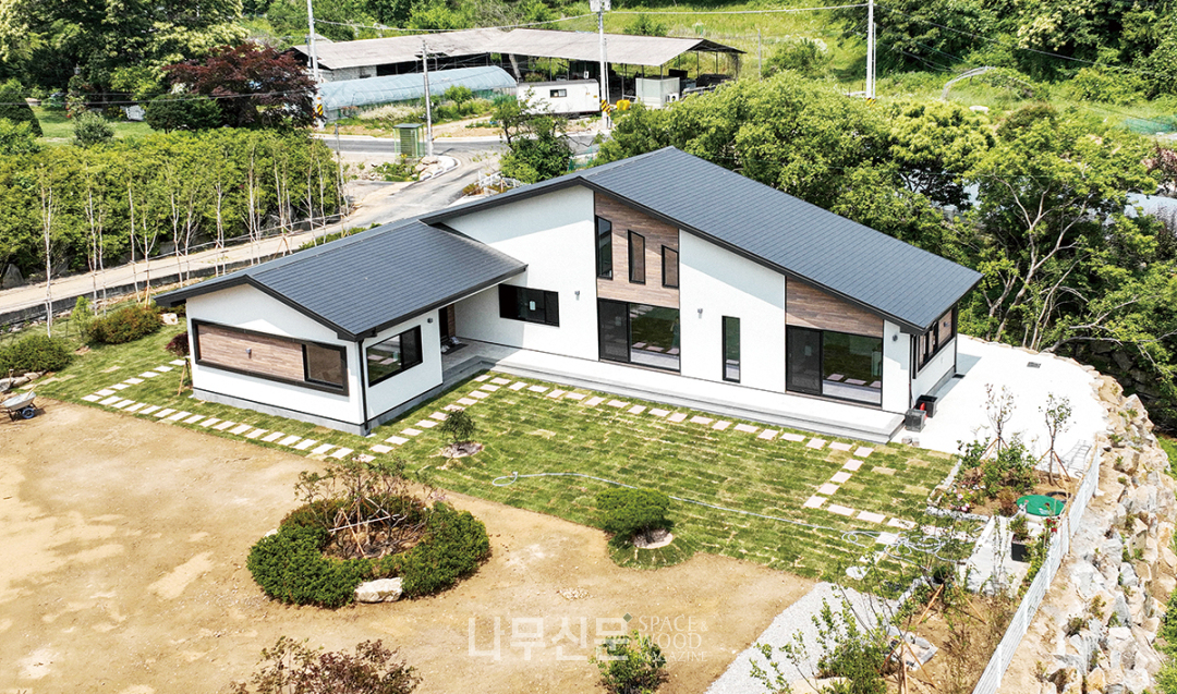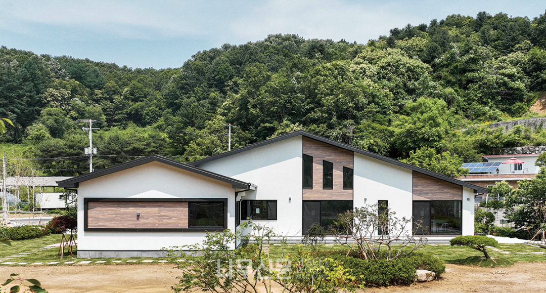 ‘최대한 자연과 어우러지는 동화 같은 집’이 건축주가 원하는 집이다. 이를 위해 공간별로 꼭 담고자 했던 것들이 있는데, 아파트에서는 느낄 수 없는 수직적 공간감이 있는 거실, 유명산 뷰를 잘 담아내며 카페와 같은 분위기를 느낄 수 있는 주방, 반신욕을 좋아하는 아내를 위한 욕조 옆 낮은 창이 있는 욕실 등이다. 나무를 좋아하 는 만큼 예산 범위 내에서 조경에도 신경을 썼다.