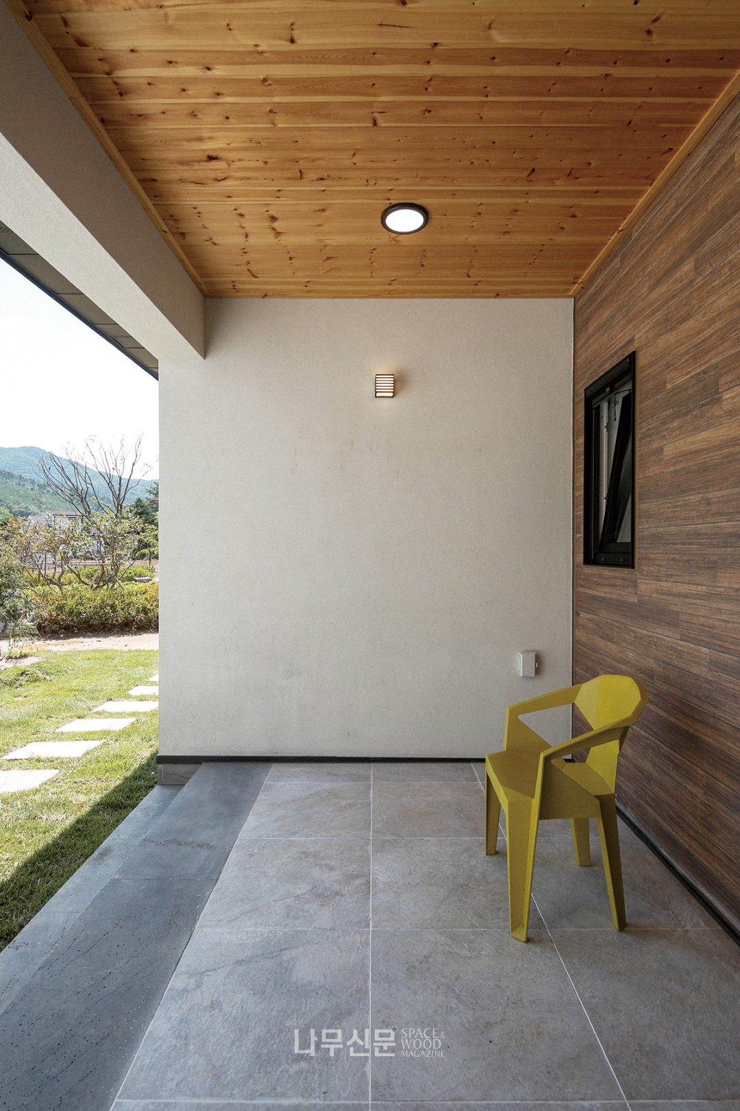 데크는 흔히들 많이 하는 현무암 데크보다는 베이지톤의 마천석 세라믹 타일로 마감해 건축물과 조화를 이루었다.