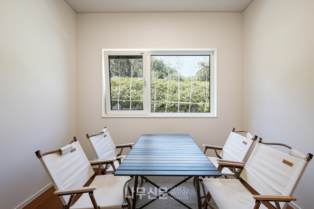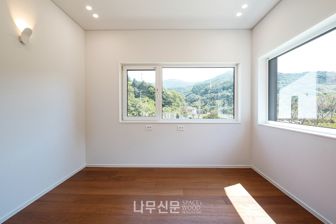 내부 인테리어는 화이트&우드의 마감재를 사용해 편안함을 느낄 수 있는 공간 연출에 초점을 맞추었다. 가장 특징적인 부분은 공간의 힘을 실은 인테리어 요소를 넣기보다는 창과 창밖 풍경이 인테리어가 될 수 있도록 여백을 살렸다. 깨끗한 마감과 전체적으로 일관성 있는 무드를 살리고자 했다.