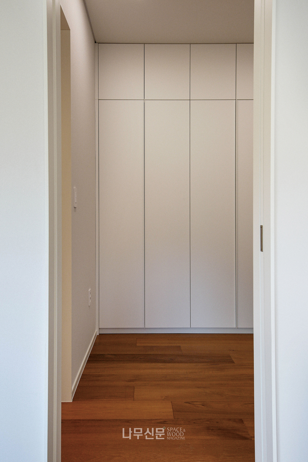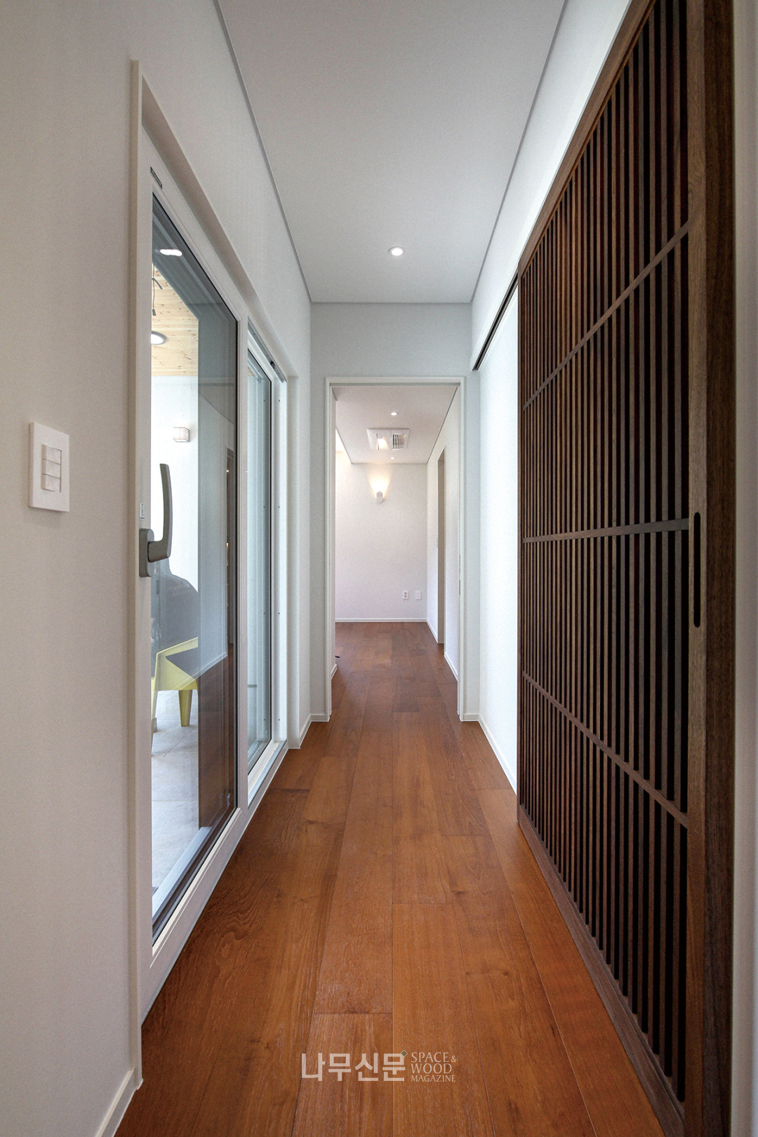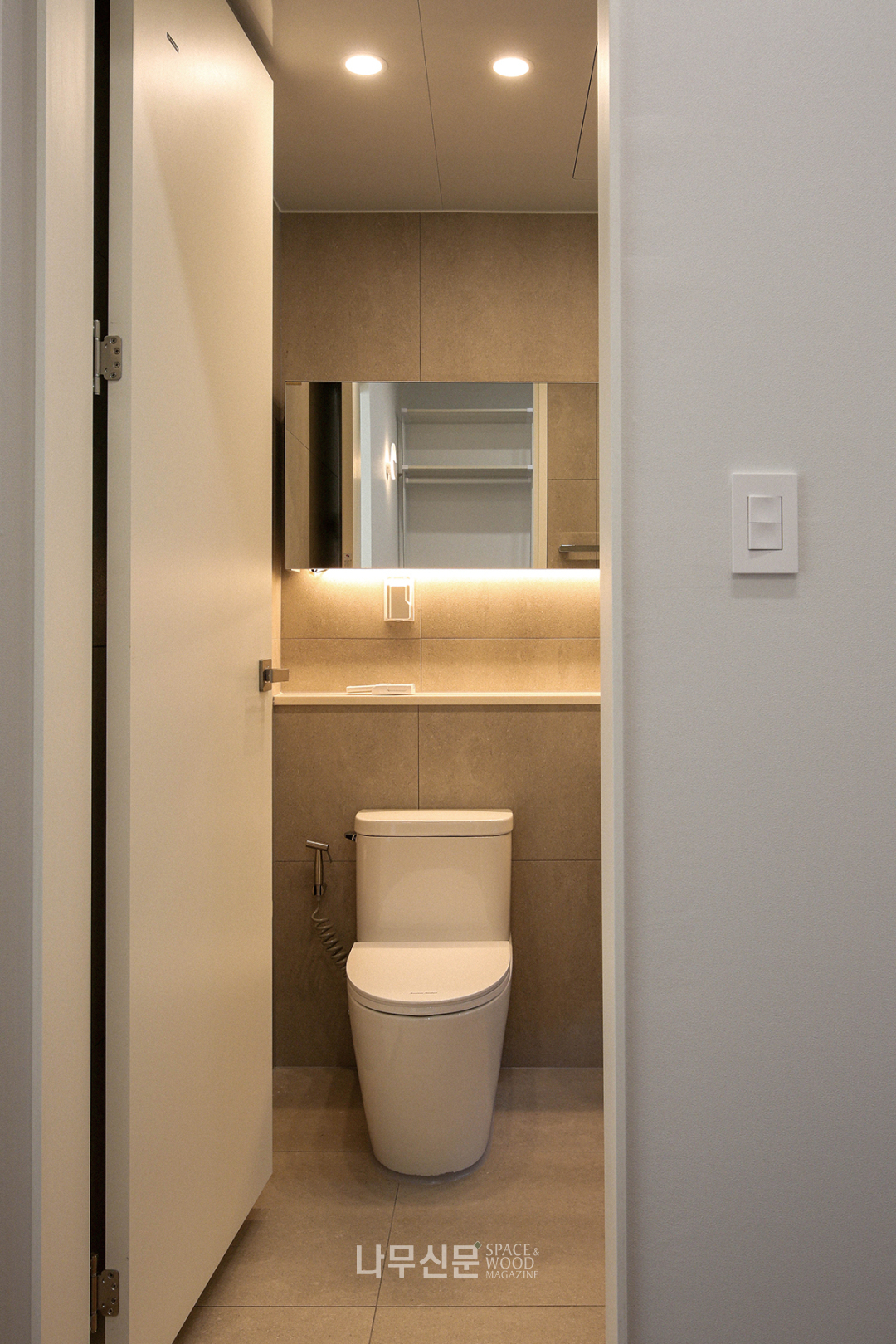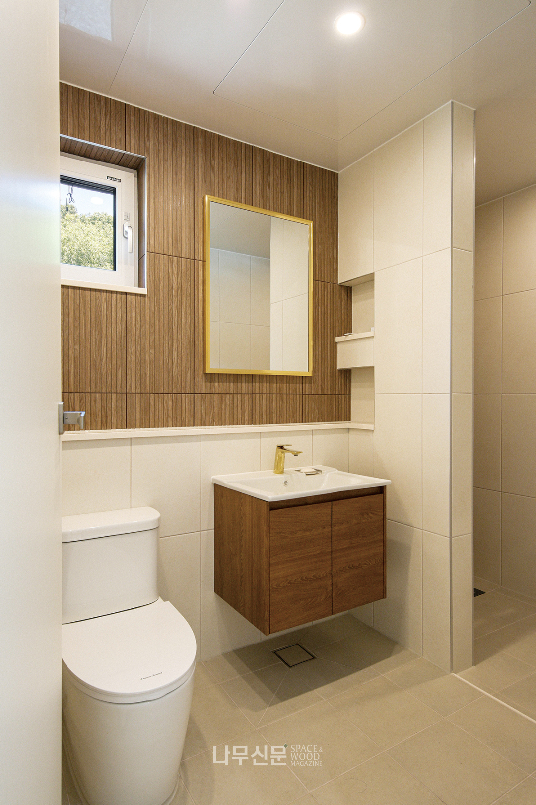 대신 현관 중문의 경우 전반적인 인테리어 무드에 맞는 원목 슬라이딩도어를 적용했으며, 욕실도 어둡고 중후한 이미지보다는 따스한 분위기를 낼 수 있는 타일과, 이에 어울리는 하부장을 제안하게 됐다.