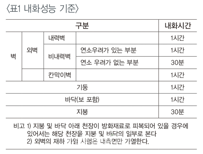 (1) 벽, 기둥, 바닥, 보, 지붕은 건축물의 피난·방화구조 등의 기준에 관한 규칙 별표에 따라 다음의 표에 정한 것 이상의 내화성능을 가진 내화구조로 하여야 한다.