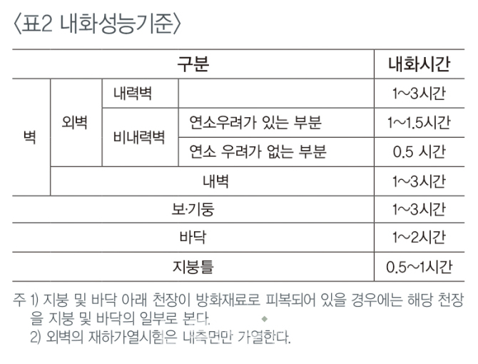 경골목구조에서 토대에는 산림청 고시한 ‘목재의 방부·방충처리기준’ 및 ‘임산물 품질인증규정’에 있는 목재의 사용환경 범주 H3에 해당하는 목재를 사용해야 한다 고 되어있고, 내화설계로서 주요구조부는 다음표와 같은 내화 성능을 가진 부재를 사용하여야 한다. <표1>