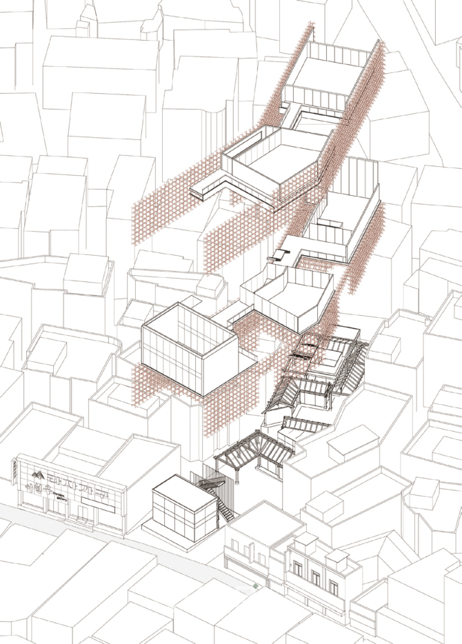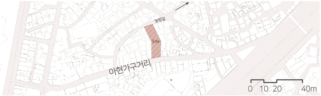 본 프로젝트의 대지는 외부인과 상인들이 지나다니는 아현 가구거리와 동네 사람들이 살아가는 북아현동의 골목 사이에 위치하고 있다. 대지 내 필지들에 있는 5~60년대의 개량한옥들은 90년대 이후에 지어진 다세대주택들 사이에 끼어있으며, 좁은 골목으로 인해 합필이 아닌 이상 재건축이 힘든 실정이다. 이러한 상황에서 기존 삶의 흔적들과 길을 지우는 재건축이 아닌, 동네의 정체성을 남기고, 가구거리의 의미를 살리며, 사람들과 시간을 잇는 새로운 공간을 찾고자 한다.