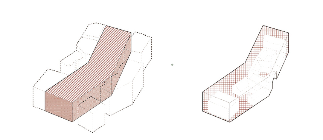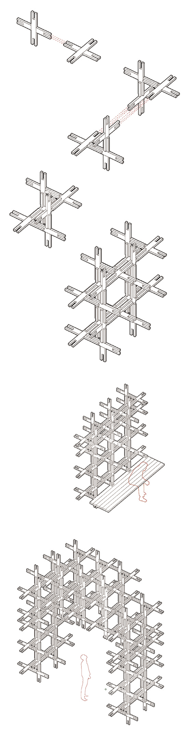 작고 가벼운 나무 조각들은 합쳐져 벽, 바닥, 지붕이 되고, 공간과 덩어리를 만들어낸다. 이때 만들어지는 매스는 콘크리트 덩어리와 같이 육중하고 막힌 매스가 아닌, 겹쳐진 조직들이다.