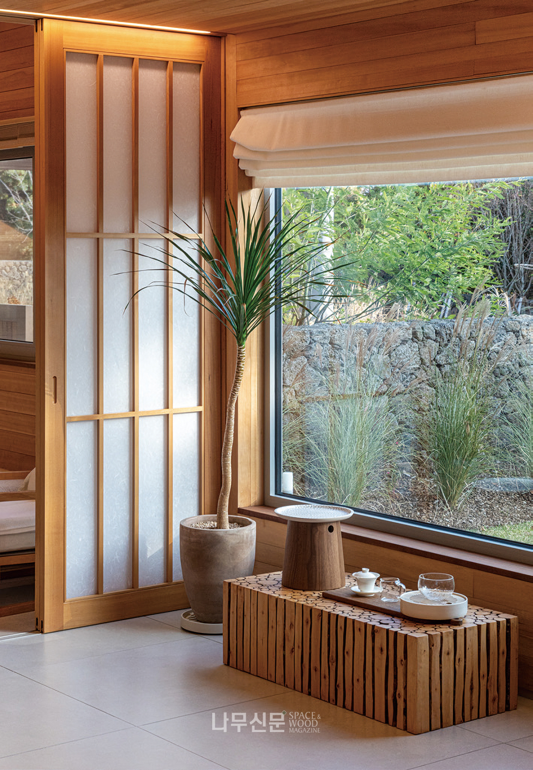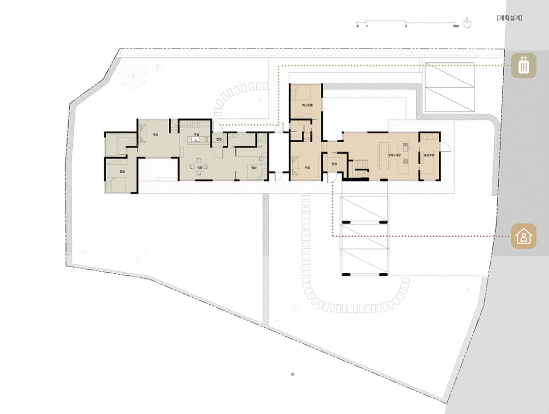 건축주 또한 육지에서의 생활을 정리하고 제주로 내려와 가족들과 함께 터를 잡았고, 더욱 단단히 뿌리 내리기 위한 다음 발걸음을 준비하고 있었다. 건축주는 계획 초기부터 실제 거주할 안채와 프라이빗 렌탈하우스(농어촌 민박)로 활용할 별채를 염두에 두고 있었다. 그리고 별채에서는 기존 보편적인 주거에서 전혀 경험하지 못했던 공간과 재료, 마당을 만끽하길 바랐다.