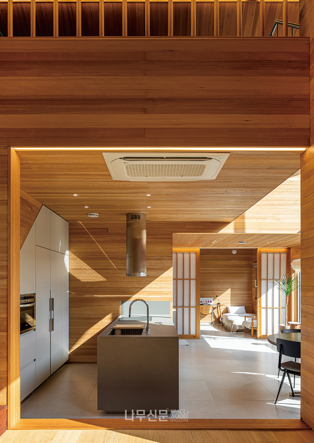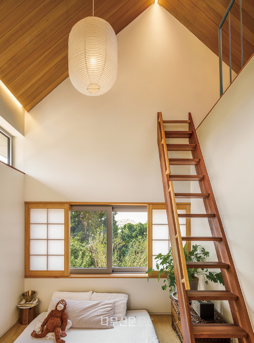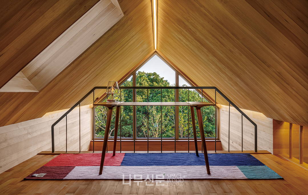 또한, 실내에선 높은 천정고를 확보해 훨씬 더 개방감이 느껴지고, 다락 공간의 활용으로 풍부한 수직적 경험이 가능하다.
