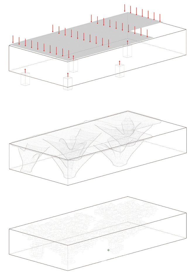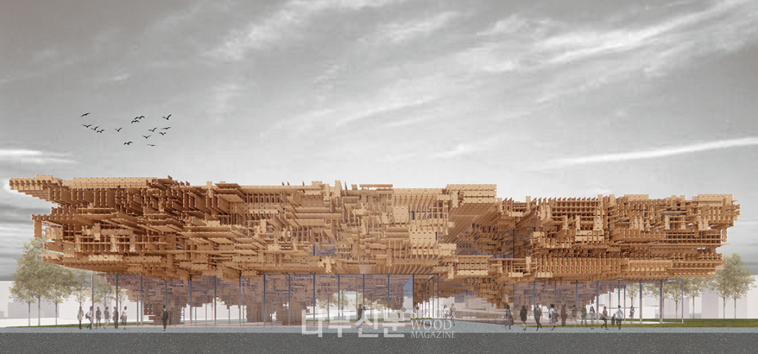 첫 번째 부재가 사용된 전시관은 위상 최적화 알고리즘을 사용해 구조체를 설계 했다. 효율적인 재료 배치를 통해 구조물을 경량화했다. 이로써 하중에 따라 자연스럽게 배치된 목조 기둥들은 슬래브로 이어지며 하나의 부재가 결합된 전체를 구성한다. 자료제공=한국목조건축협회 | 정리=김오윤 기자 /나무신문