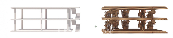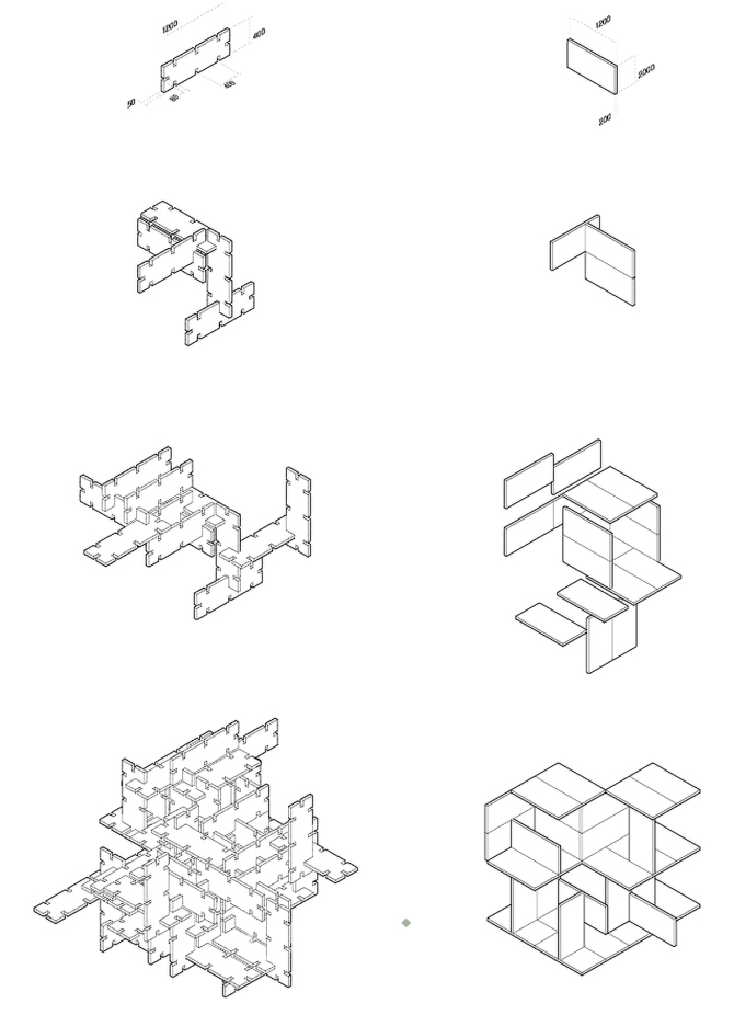 기둥과 슬래브 등 각기 다른 부재의 조합으로 건물이 생산된다. 이러한 대량 맞춤화 방식에서 한 단계 더 나아가 보, 기둥, 외장재, 내장재 상관없이 다양하게 기능할 수 있는 단일 부재를 고안했다. 단일 부재 간의 다양한 조합으로 만들어진 구조는 그 자체로 공간이 된다. 이를 가능하게 해줄 수 있는 재료는 재단과 운송, 조립이 용이한 구조재인 CLT이다. 텍토닉과 스테레오토믹을 넘나드는 CLT 단일 부재의 조합으로 건축 생산 방식의 패러다임 변화와 미학적 가능성을 탐구했다. 목적에 따라 두 가지의 단일 부재를 고안했다.