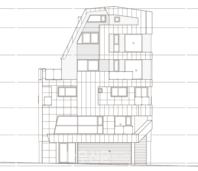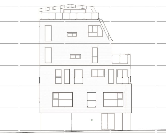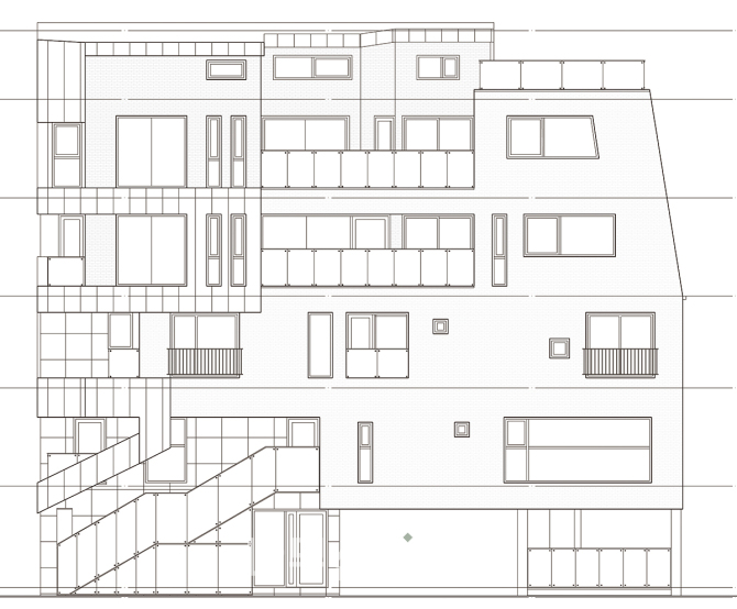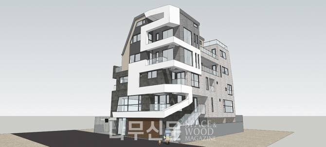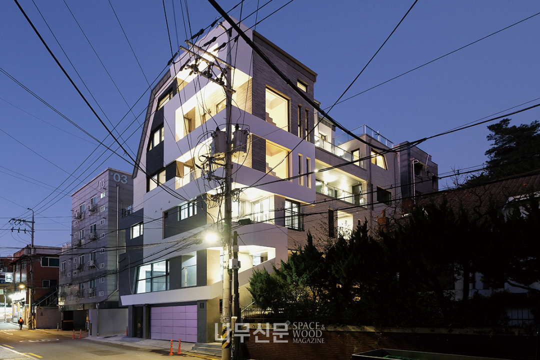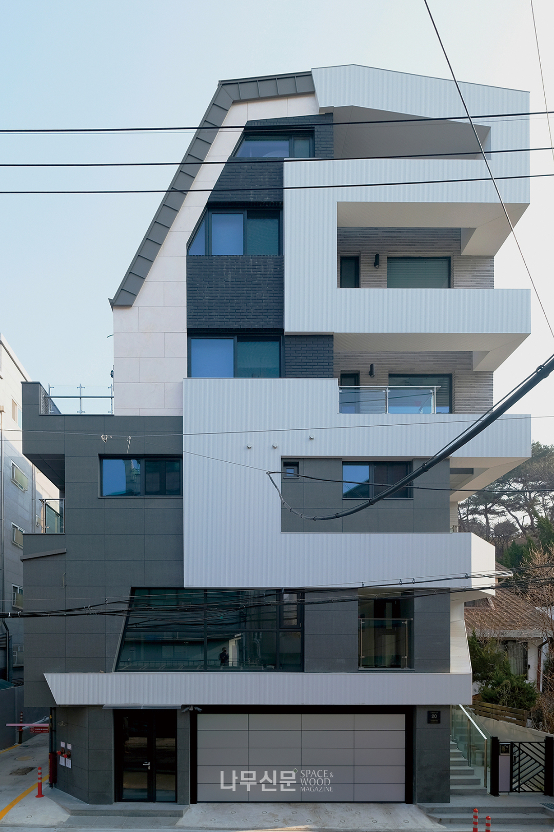새로운 프로젝트에도 그 구성을 그대로 가져와서 맨 위 다락과 5층은 건축주 가족이 아래 4층은 어머님을 위한 층으로 구성했다. 나머지 층은 임대주택 및 근린생활시설로 구성했다. 특히 지하층은 높은 층고를 가진 곳인데, 무용을 전공하는 딸의 연습실을 만들어주려는 건축주의 간절한 염원이 담긴 공간이다. 지하 터파기를 하는 동안 3미터 높이의 암반을 모두 깨내는 수고로움과 노력을 고스란히 녹여내야만 했다.