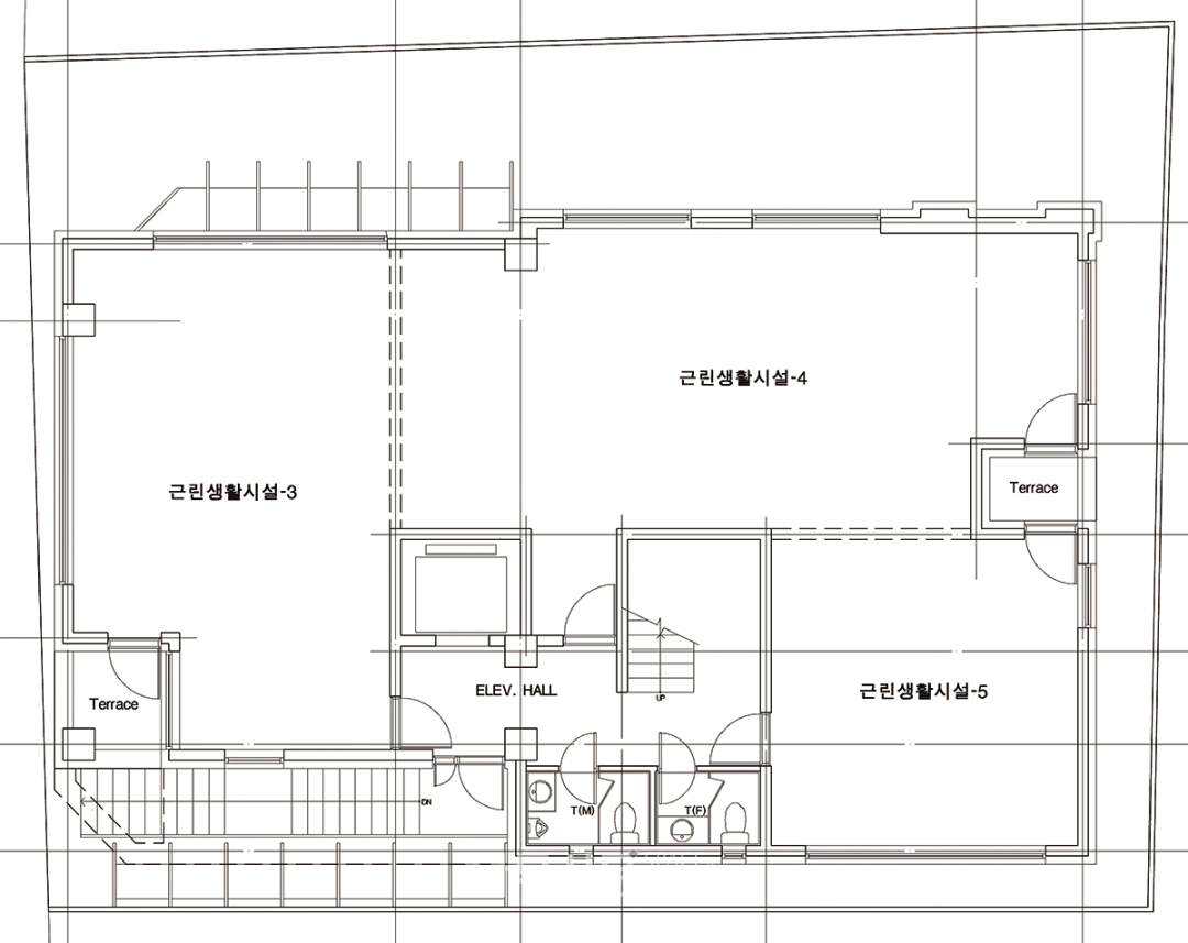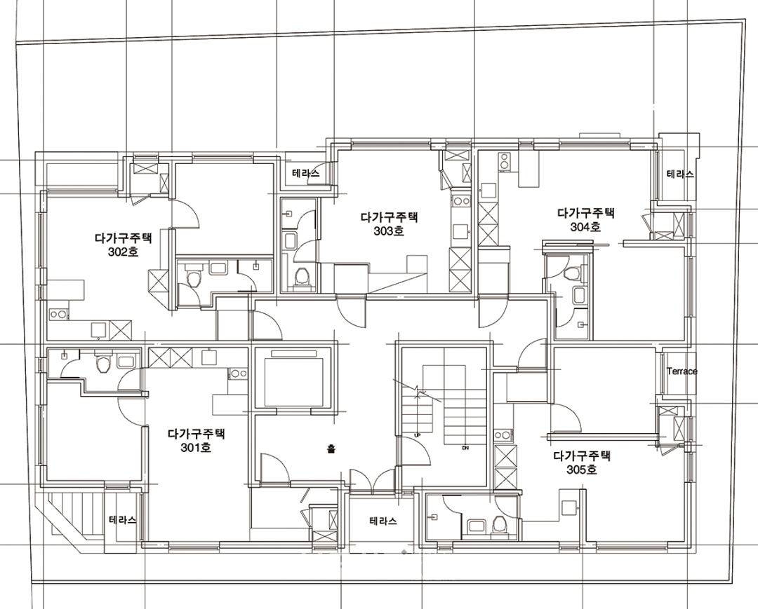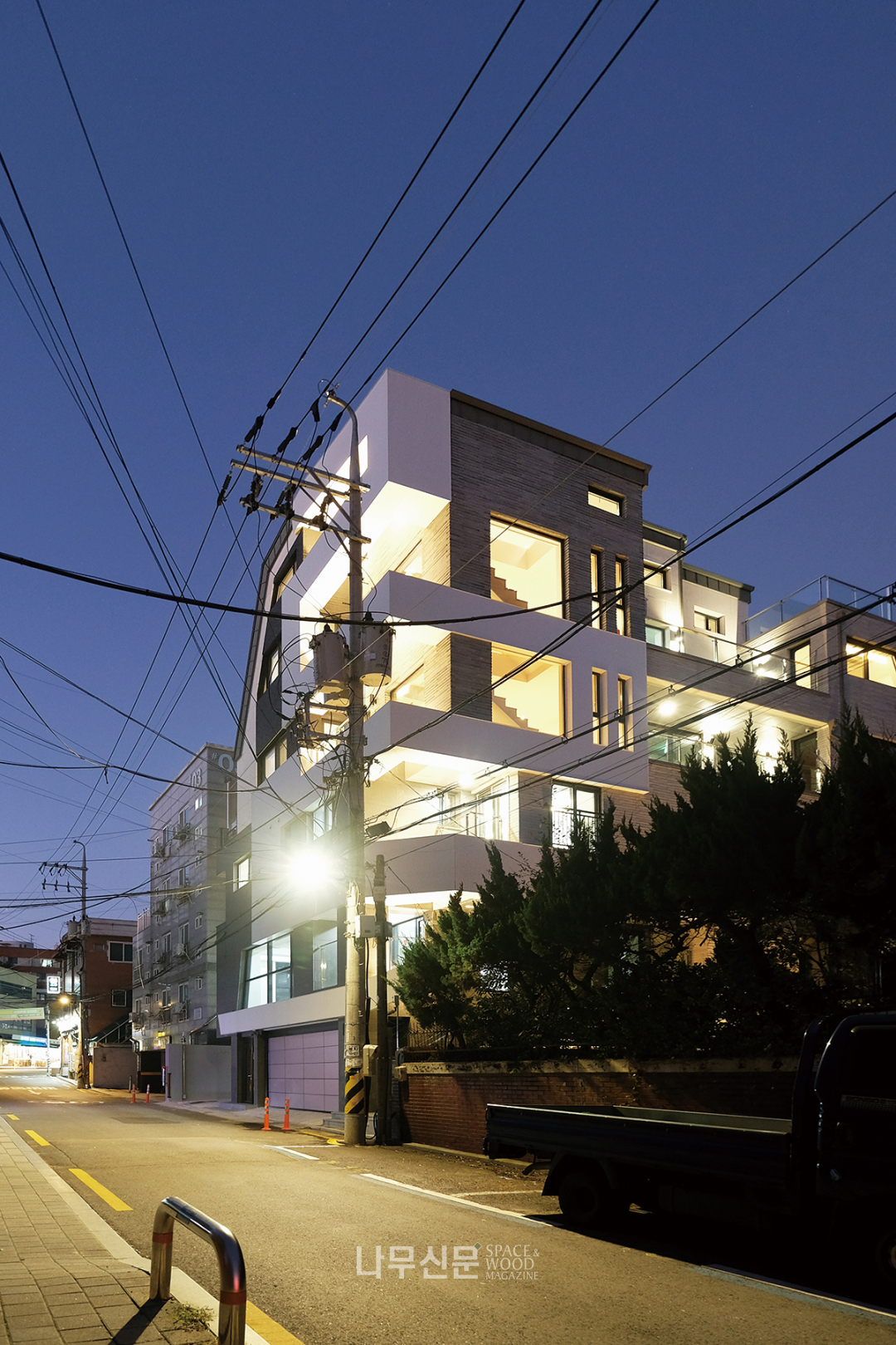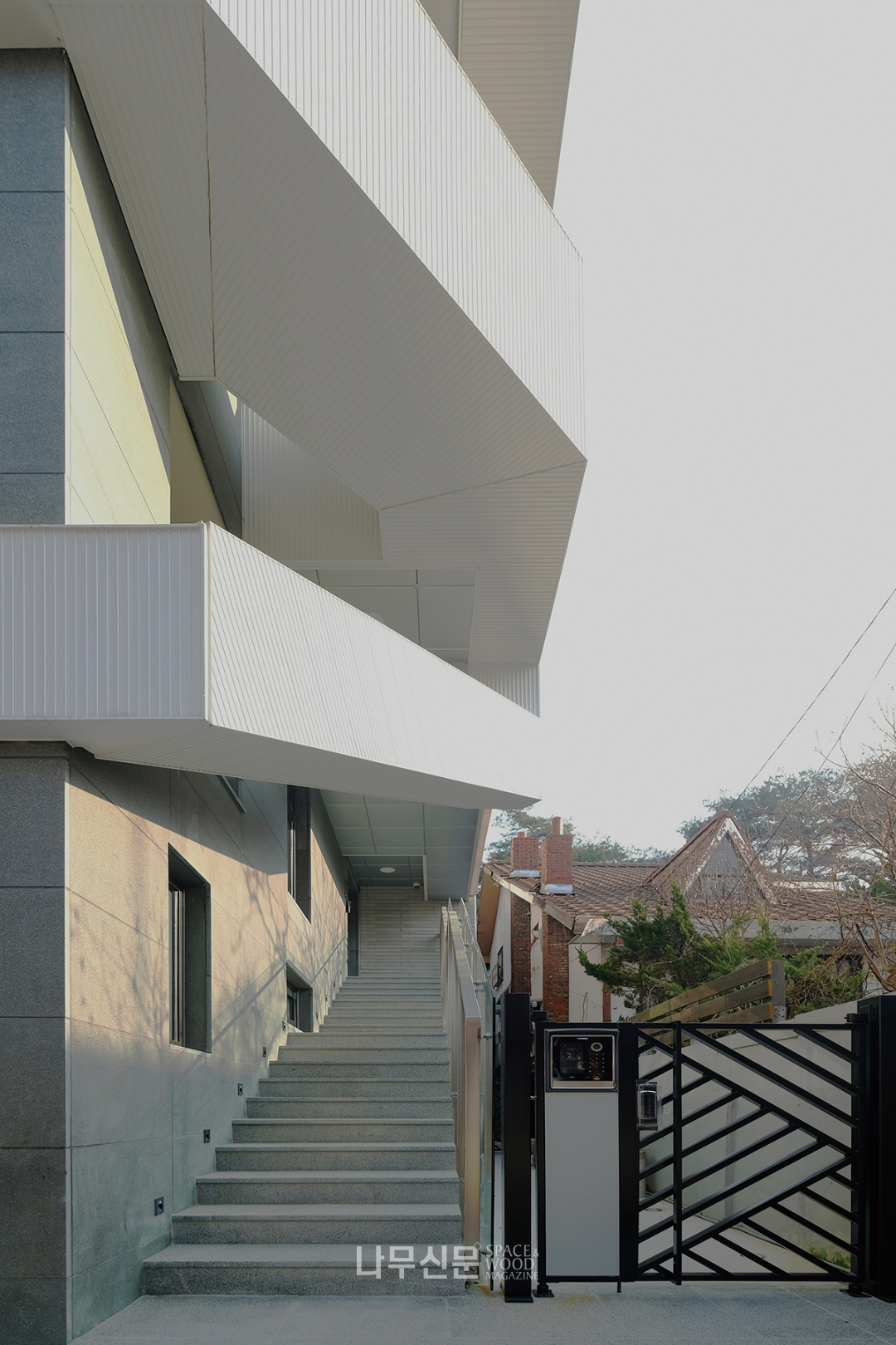 2층의 근린생활시설과 3층의 임대주택에는 외부 테라스를 곳곳에 배치해 외기를 맞이할 수 있는 여유 공간을 제공해주고자 했다. 특히 3층의 임대세대는 1개씩의 외부 테라스를 가지는데, 애써 만든 공간이 실외기실로 전락하지 않도록 세대별 실외기실을 각각 계획해 냉난방설비를 완비해두었다.