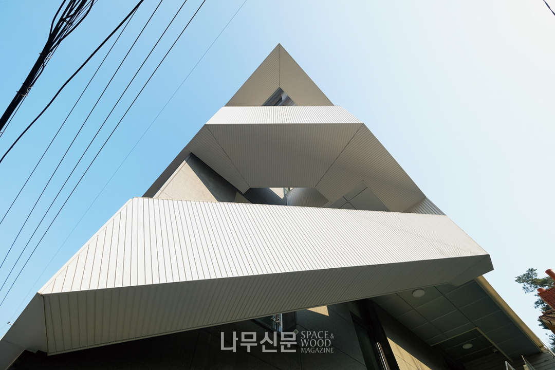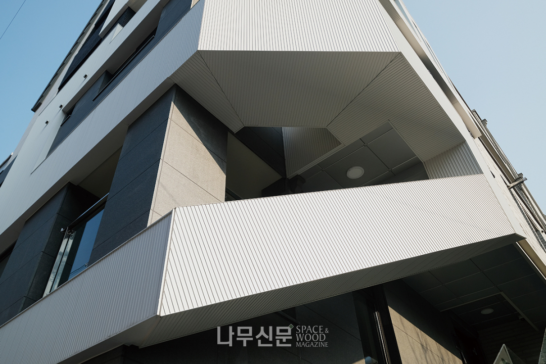 기능적으로 여러 가지 내용을 담는 층별 평면을 외형으로 표현하기에는 단조로운 입면보다는 여러 가지 재료들의 물성이 맞물린 파사드가 필요하다고 느껴졌다. 화이트 톤의 메가판넬 띠는 이런 다양한 재료들을 묶어주기도 하고, 재료들을 경계 짓기도 하면서 커다란 흐름을 만들어내는 중요한 매개체로 설정됐다.
