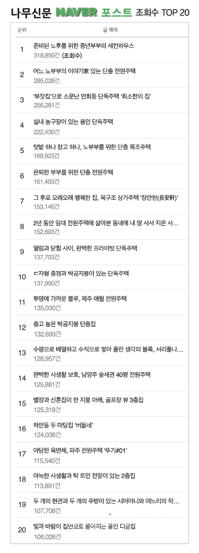 그동안 나무신문 네이버 포스트에 소개된 목조주택을 필두로 한 단독주택 사례들도 구독자들의 많은 사랑을 받았다. 31만8000회 이상으로 최고 조회수를 기록한 ‘준비된 노후를 위한 중년부부의 세컨하우스’를 비롯해 조회수 20만 회을 넘긴 사례는 ‘어느 노부부의 이야기家 있는 단층 전원주택’. ‘부잣집으로 소문난 연희동 단독주택, 최소한의 집’, ‘실내 농구장이 있는 용인 단독주택‘ 등이다.