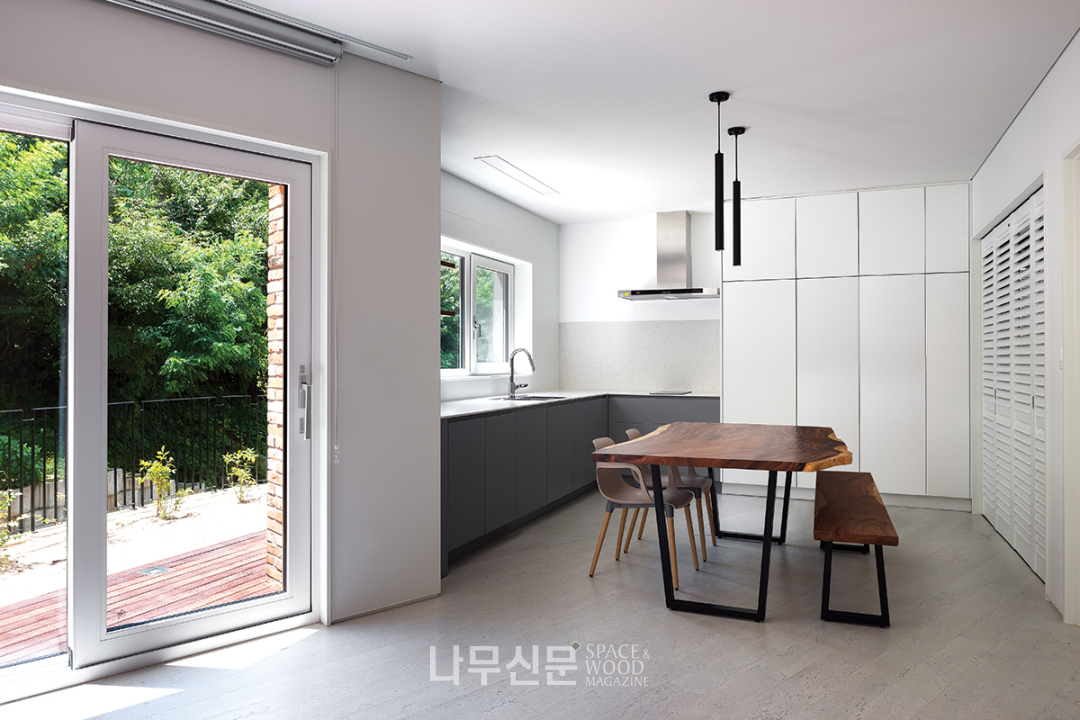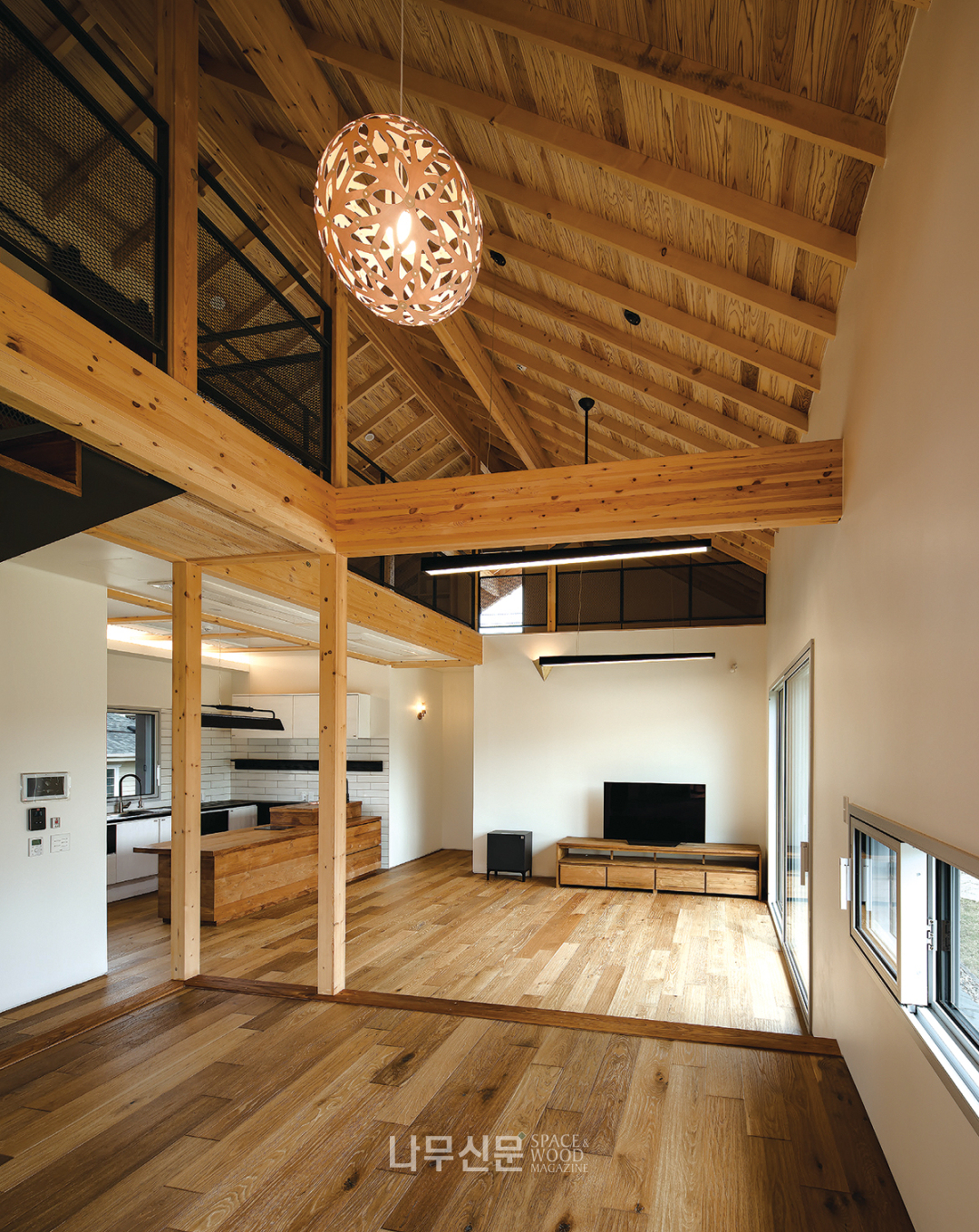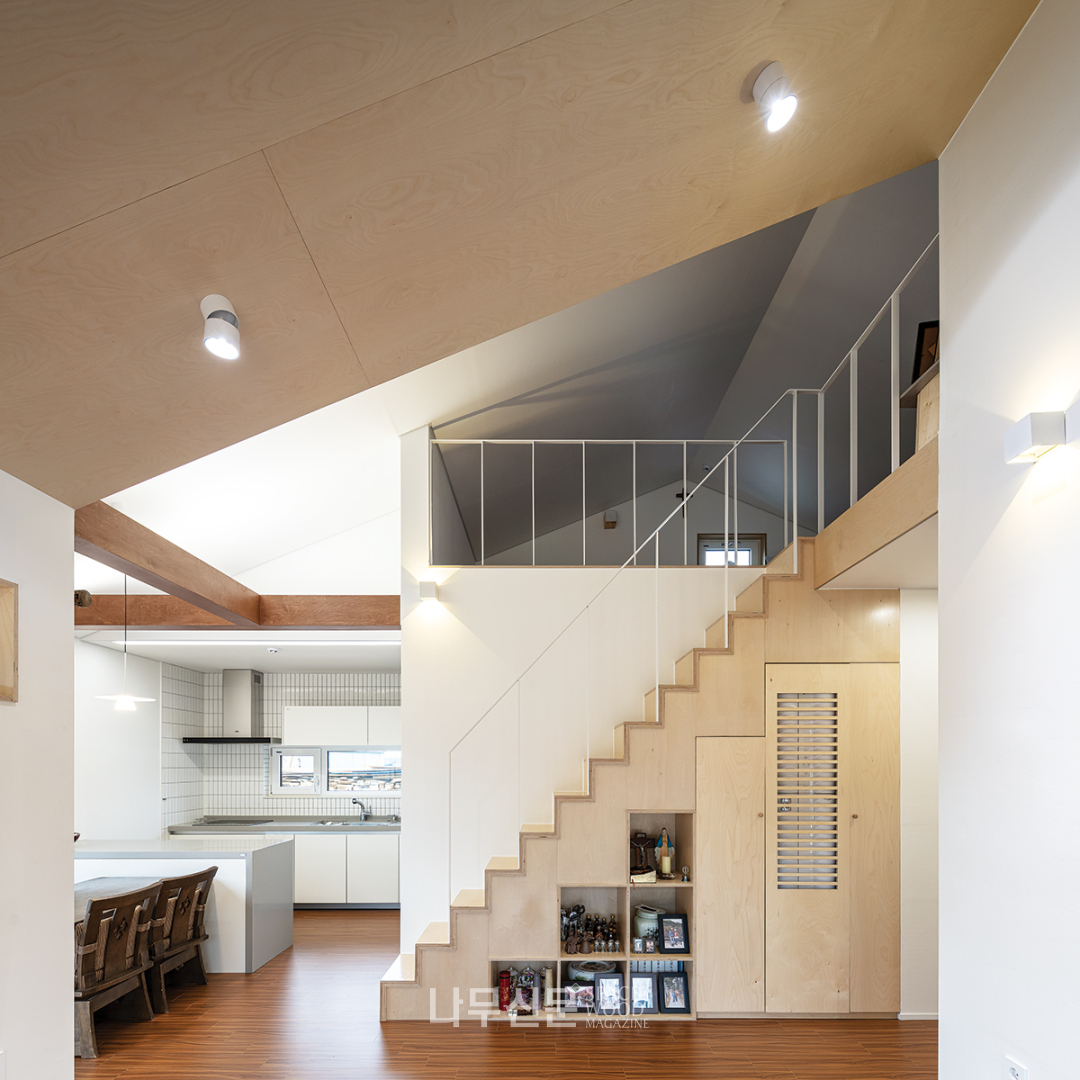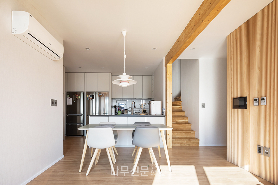 부부의 노후를 대비해 설계된 이 주택은 경골목구조와 단층 구조를 채택해 동선이 짧고 편리하다. 남향 배치는 하루종일 밝고 따뜻한 채광을 확보했으며, 오픈형 거실과 주방을 중심으로 넓은 개방감을 준다. 특히 주방은 ㄷ자형 조리대를 설치해 사용자의 동선을 고려하고, 부부의 일상 소통을 자연스럽게 이어지게 했다.