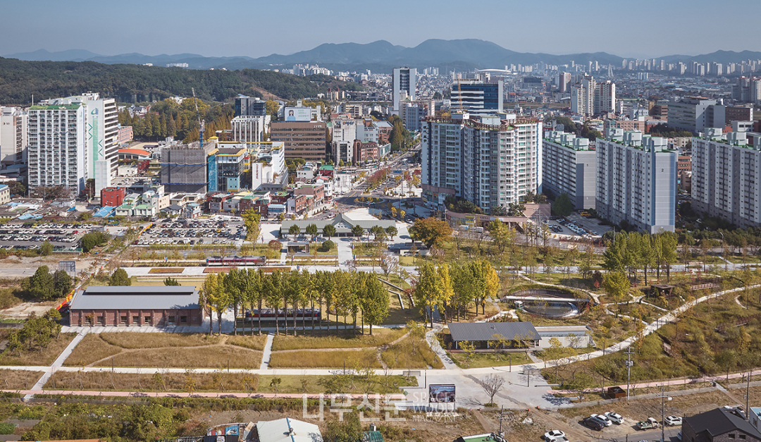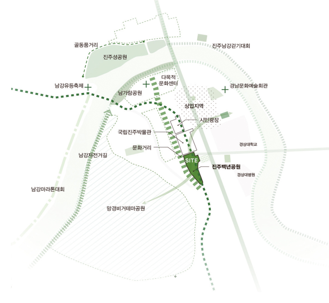 진주백년공원은 남부권 도시재생의 마중물 사업으로 지난 백 년 동안 물리적으로 단절되었던 동서 방향의 도시조직을 잇고, 남북으로 뻗어나간 기존 철로를 따라 선형의 공원을 제공한다. 시민들이 오랜 시간 공유해 온 물질에 담긴 기억과 공간적 장소성을 유지하며, 새로운 시설과 활동을 수용하도록 완결된 형태가 아닌 열린 체계의 공원으로 씨줄과 날줄을 엮어 구도심의 변화를 수용하고 촉진할 수 있는 문화생산의