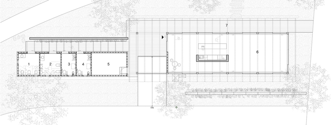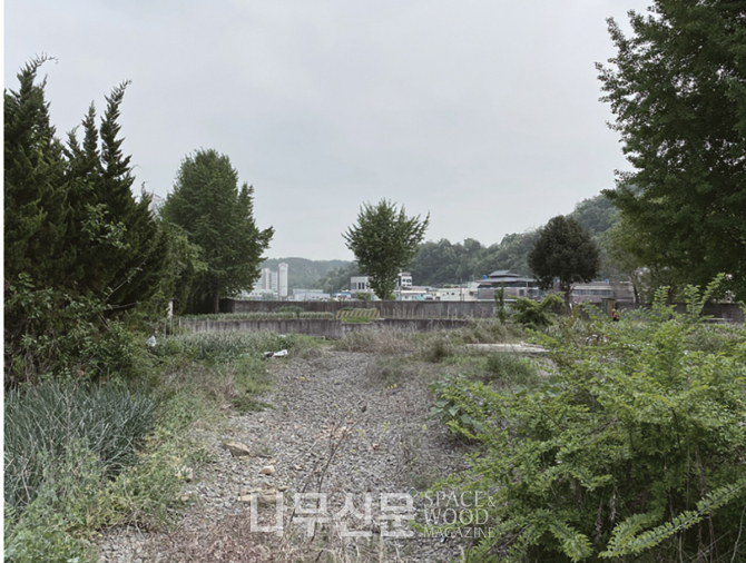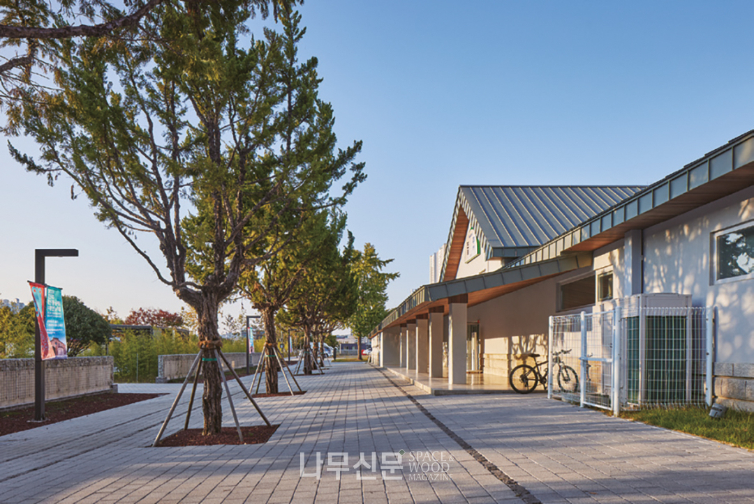 복합커뮤니티는 향후 남강 변까지 연장될 ‘문화의 거리’를 지원하고 공원 방문자에게 간단한 식음료를 제공하는 휴게시설로 제안되었다. 오랜 시간 단절되어 있던 노후 주거지(서측)의 활성화를 기대하며 동서를 잇는 주요 동선상에 자리하게 되었다. 기존 시설과 동일하게 수평성을 강조하며 지형의 미세한 굴곡과 장성한 수목에 대비를 이룬다. 아직 미완인 국내 목구조의 현재 상황을 기술적으로 또 미학적으로 드러내고, 미래의 목구조를 기대하는 마음으로 계획했다.