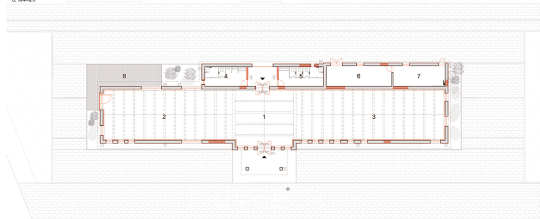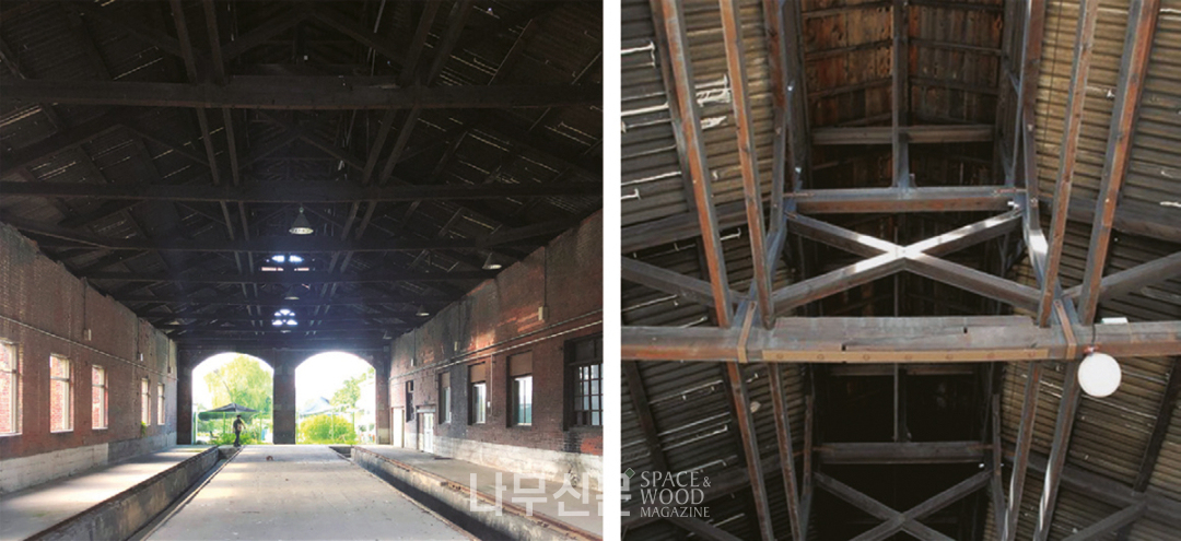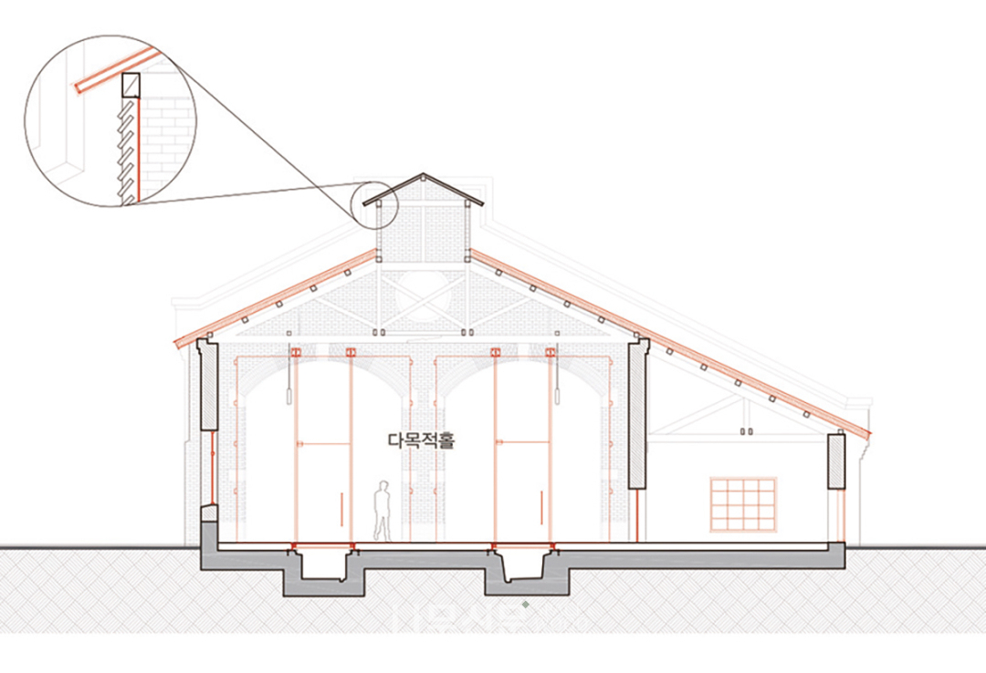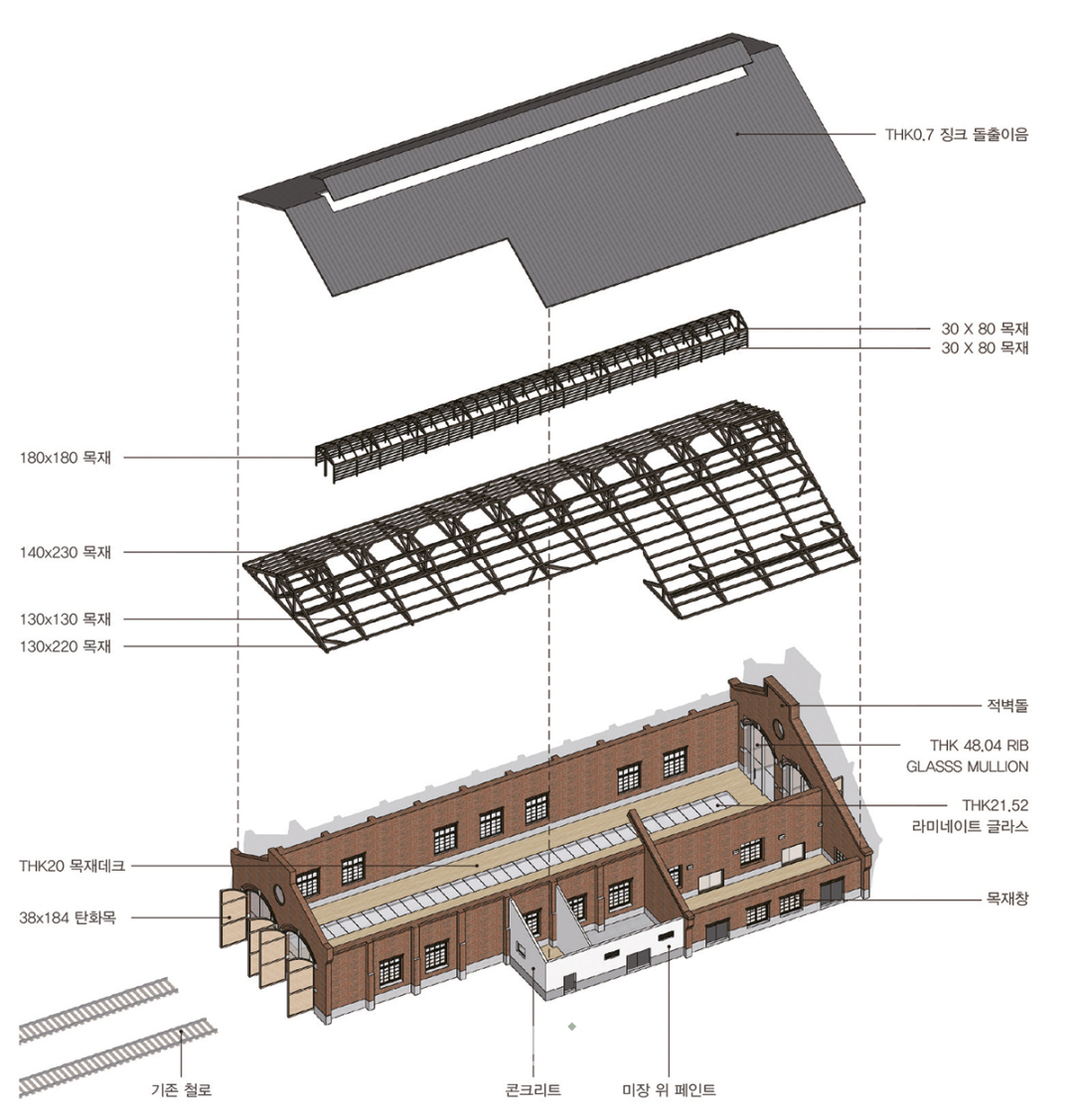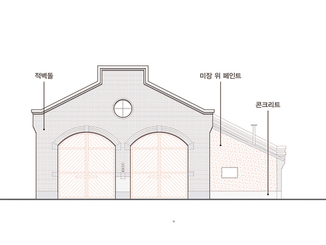 차량정비고의 리모델링은 ‘3D 스캐닝’을 통해 건물의 구석구석을 정밀하게 파악한 후에 문화재 심의위원과 협의를 통해 보수가 진행될 부분을 가려내는 지난한 과정이 요구되었다. 기존의 목조트러스는 시간이 지남에 따라 틈새와 휨이 발생했고 부분적으로 철물을 덧대며 보강했다. 노후화된 슬레이트 지붕을 징크 지붕으로 교체하며 단열을 추가하고, 부분적으로 남아 있던 PVC 창호는 목재 창을 제작해 교체했다.정면의 아치형 출입구는 접합이 최소화된 강화유리로 내외부를 구분 짓고, 외부에는 사진기록에 남겨진 그대로의 모습으로 목재 문을 추가 설치하였다.