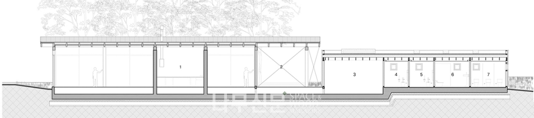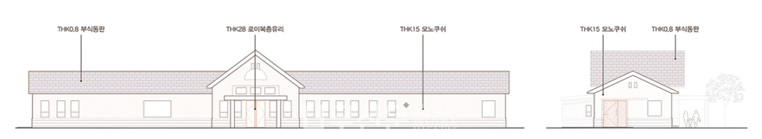 복합커뮤니티 시설은 크게 두 공간으로 나뉜다. 우측의 카페는 구조적 간결성이 명확한 중목 프레임으로 공간을 형성한다. 통창으로 내·외부가 구분된 네 면은 시각적으로 탁 트인 전망을 제공하고 서측으로 길게 뻗은 지붕은 빛을 거르며 연속된 서까래 프레임을 통해 온전히 목구조를 경험하게 한다. 좌측의 서비스공간은 2″×6″ 스터드로 이루어진 경량벽과 SIP공법의 지붕으로 계획되었다. 전면의 콘크리트월과 묵직한 느낌을 주는 색상의 모노쿠쉬를 마감재로 사용하여 내밀한 공간임을 암시한다.